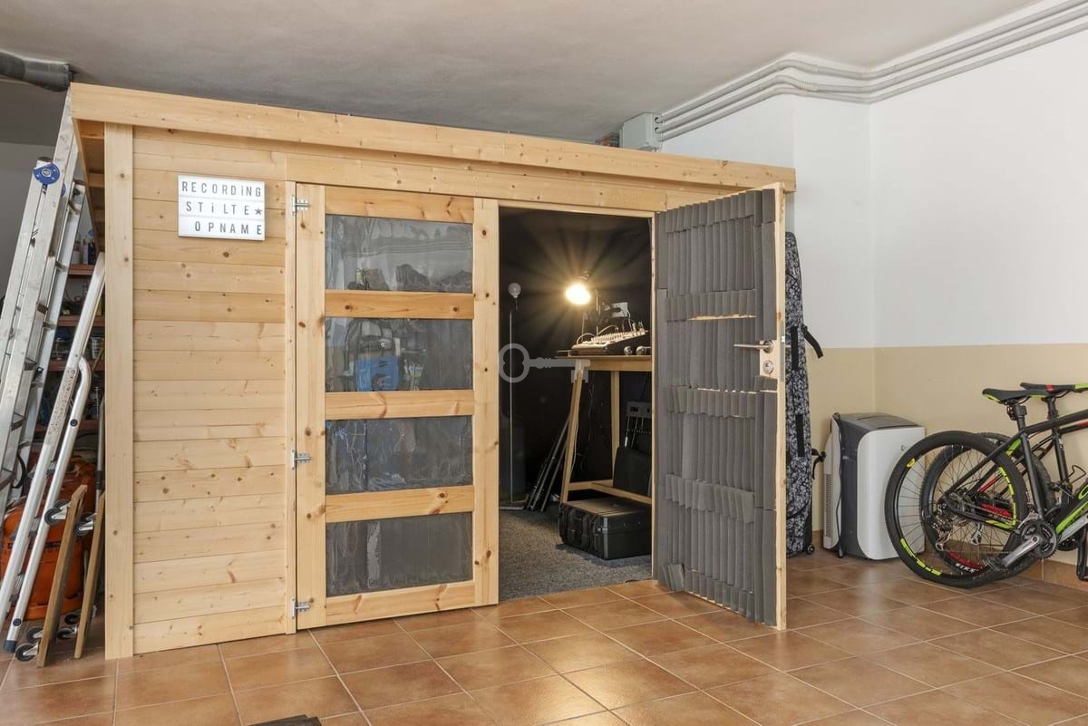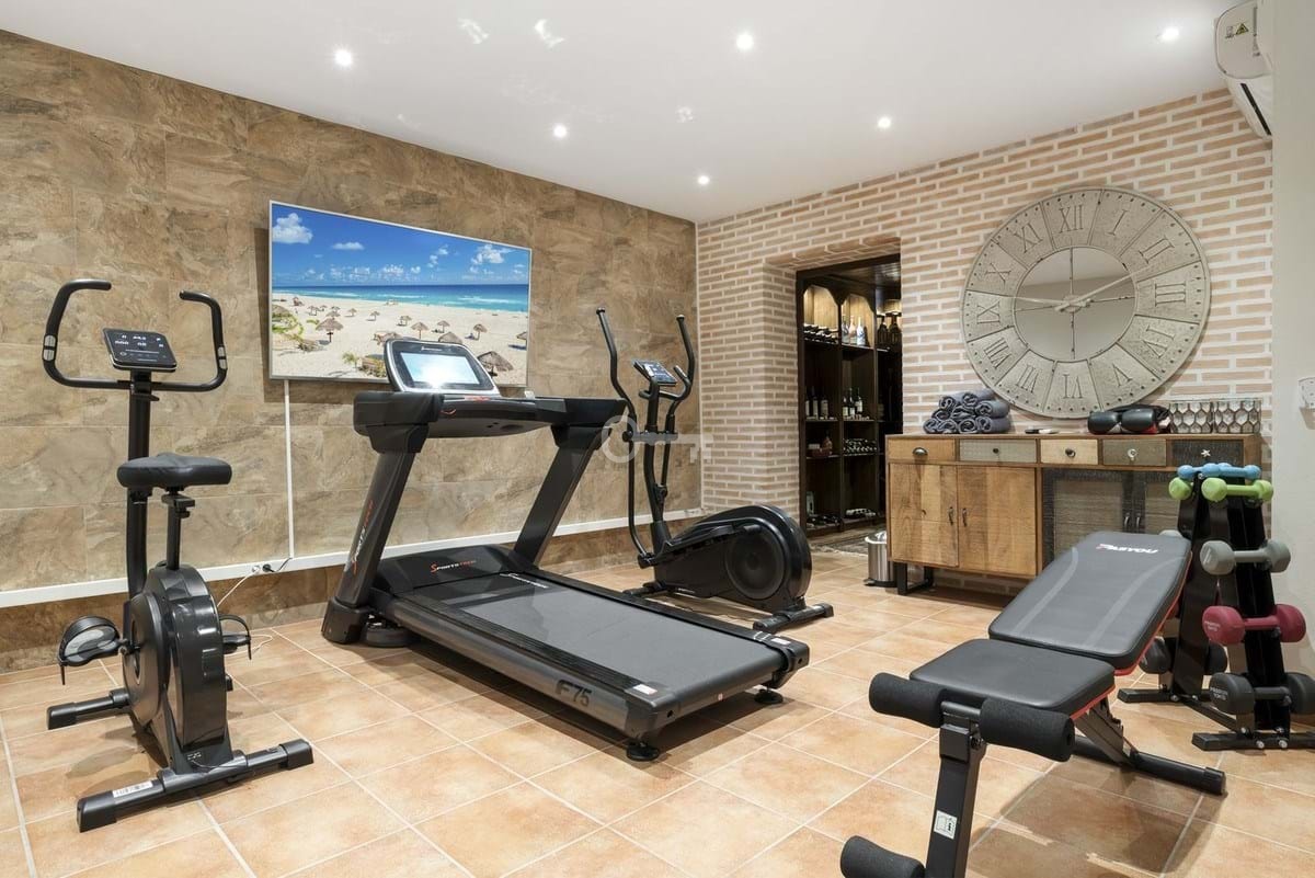 The villa benefits from a full basement. Here you will find a large games room, a fully equipped gym, and a cosy wine cellar. The 5th bedroom, perfect for guests, is also located here, along with a practical laundry room. Not to forget, an XXL garage with ample space for 4 cars plus scooters or other leisure equipment. A soundproofed music studio has also been created.