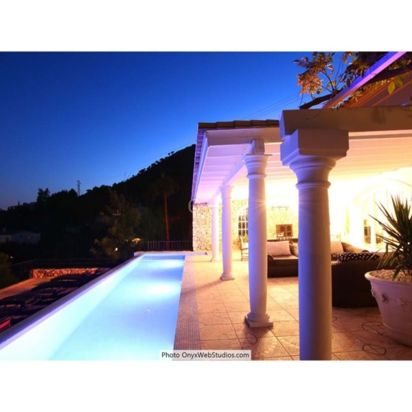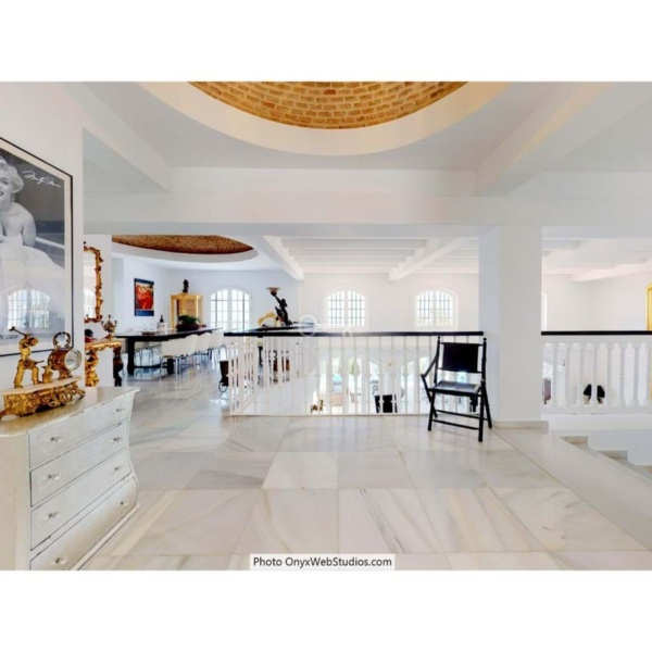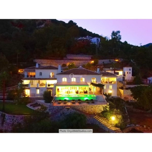 The Plot is 6092 sqm with mature garden. Impressive entrance driveway from street is leading to the villa. Villa at approx. 1.135 sqm with entrance hall leading to a large lounge with high ceilings and a fireplace, dining area and 3 doors out to the partly covered terrace with beautiful sea views and an infinity pool with heating.