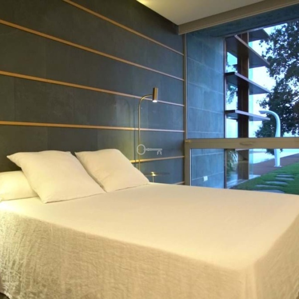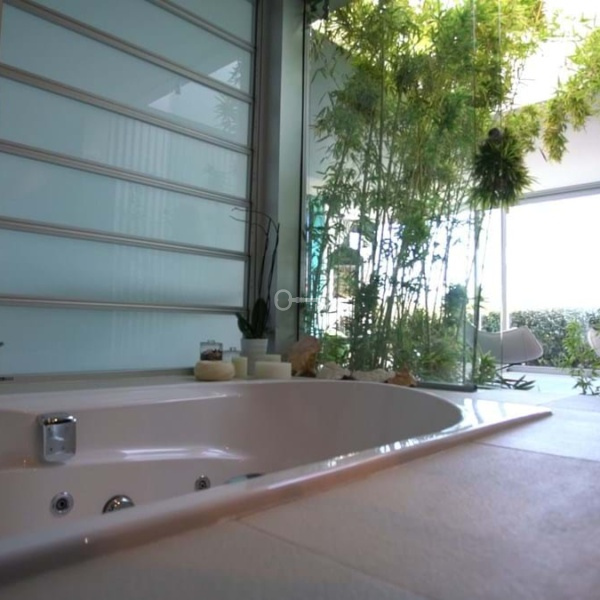 Master bedroom with dressing room and bathroom with hidro-massage bathtub, joined through a wooden walkway to the gym area.