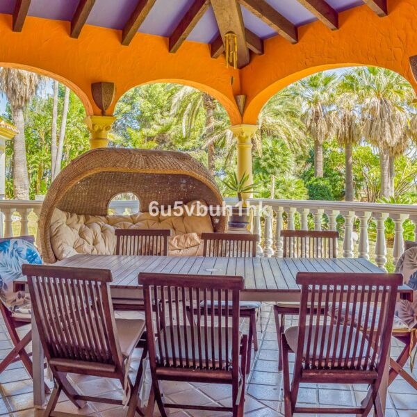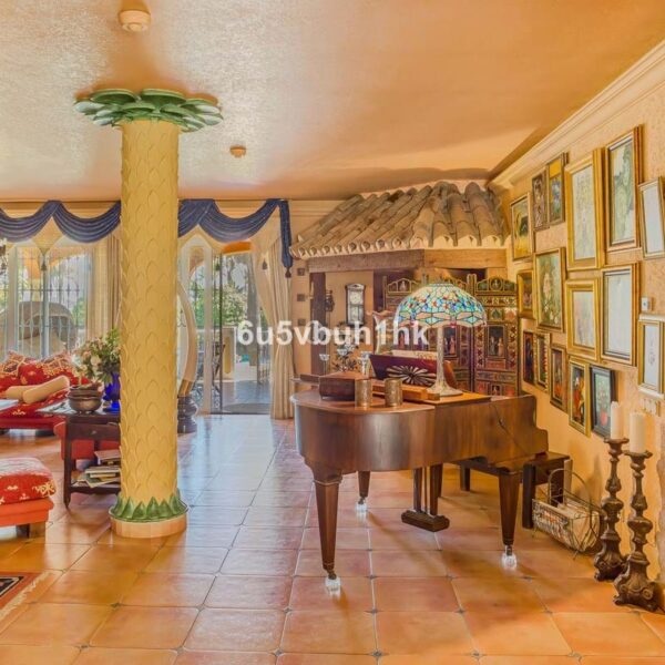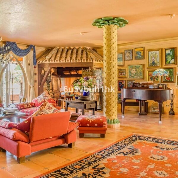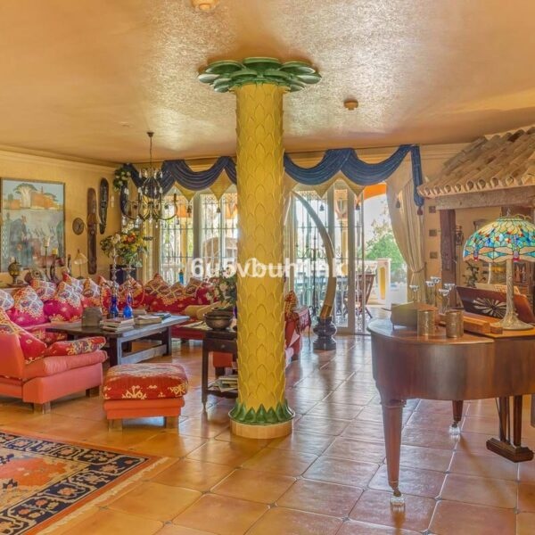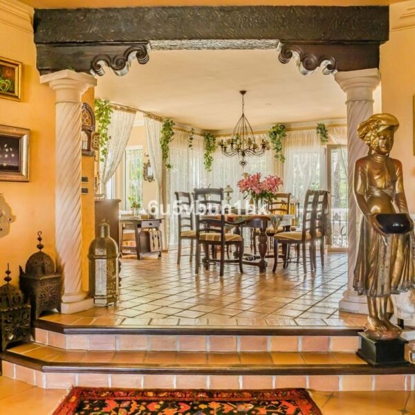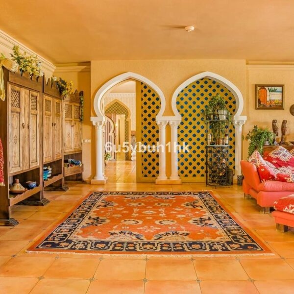 Built on two floors plus a basement, the villa features a spacious Andalusian-style entrance hall, which, like the master bedroom, evokes the majestic Nasrid palaces of the Alhambra in Granada. A large living room with a separate dining area, connected to a spacious kitchen, presents a blend of styles reminiscent of medieval architecture. There are also three additional large bedrooms and impressive bathrooms with Jacuzzis in various styles.