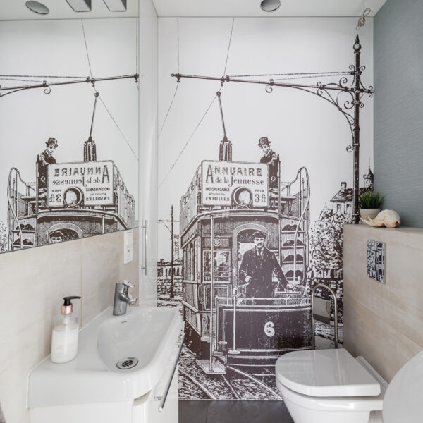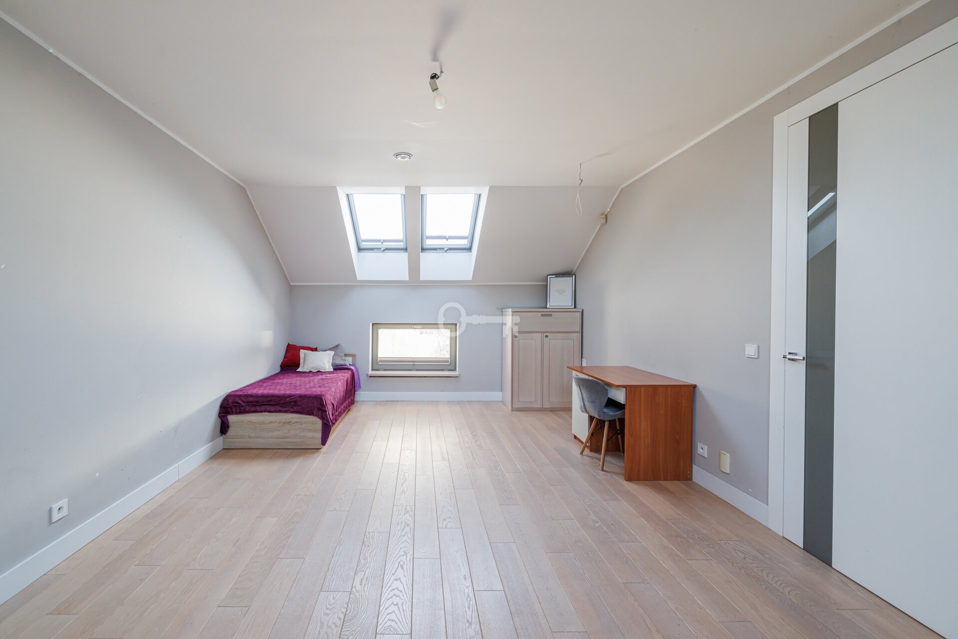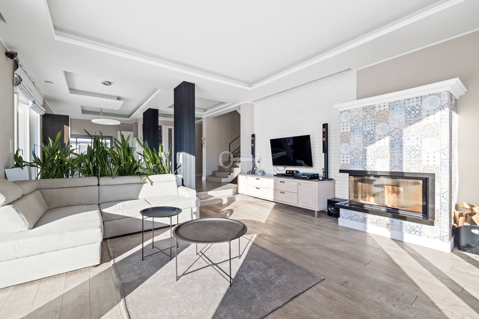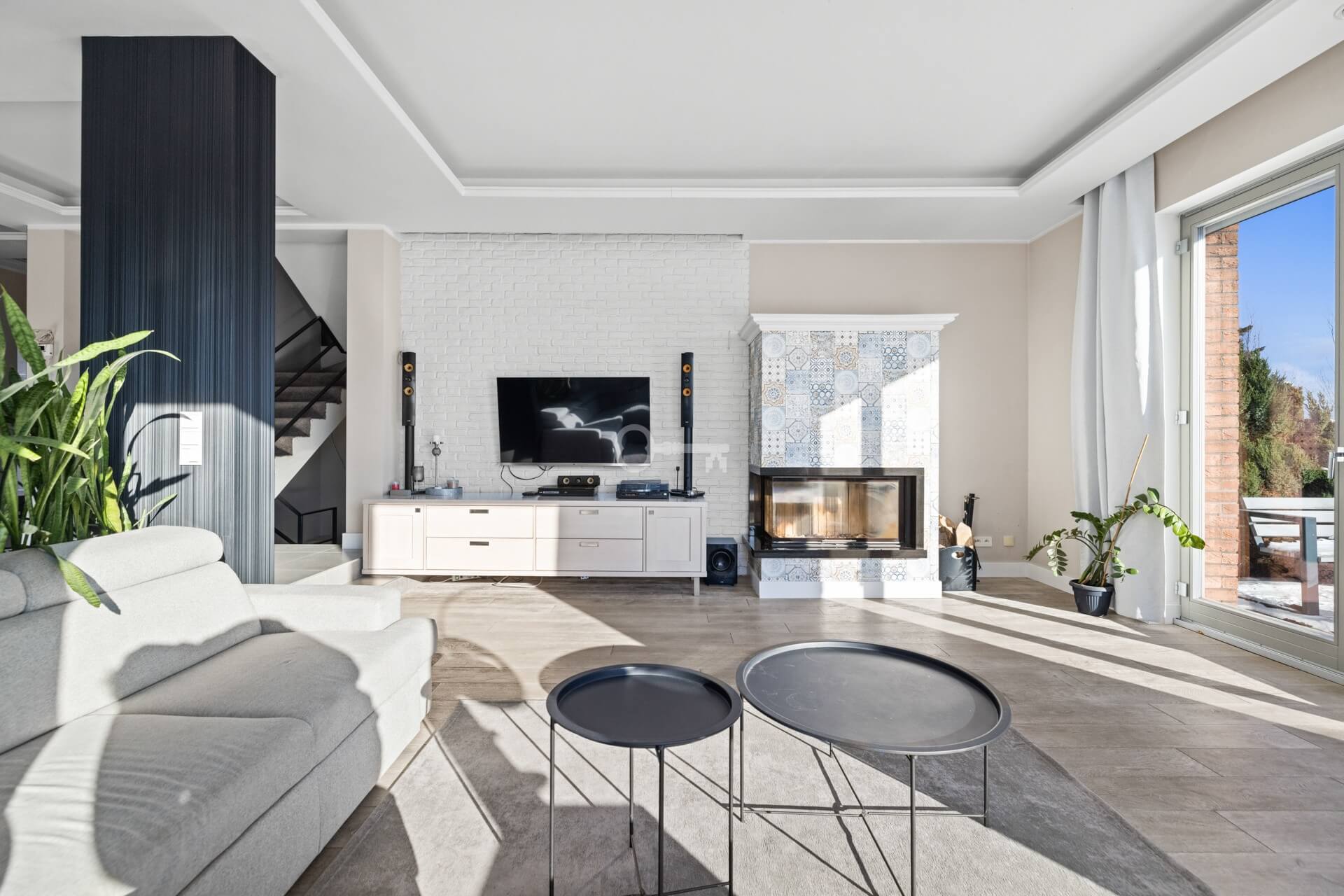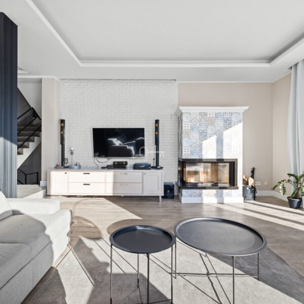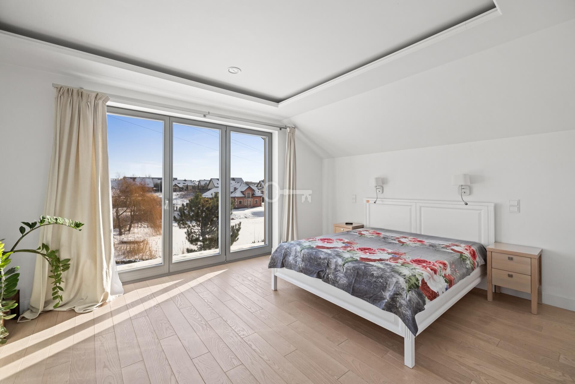 The spacious living room with a fireplace seamlessly connects to the dining area and large glazing opening onto the terrace and garden overlooking the pond—this is the heart of the home, perfect for everyday living and entertaining guests. Underfloor heating has been installed throughout the house, along with triple-glazed windows and high-quality finishing materials, including wooden flooring—brushed whitewashed ash and sandblasted stained oak—which add warmth to the modern, bright interiors.