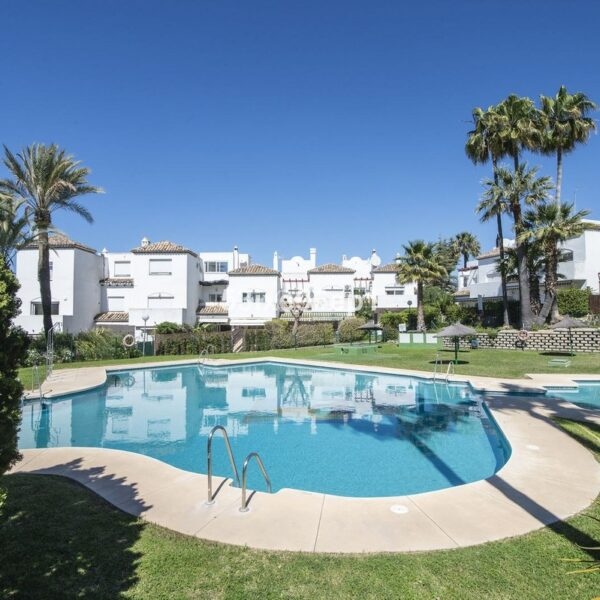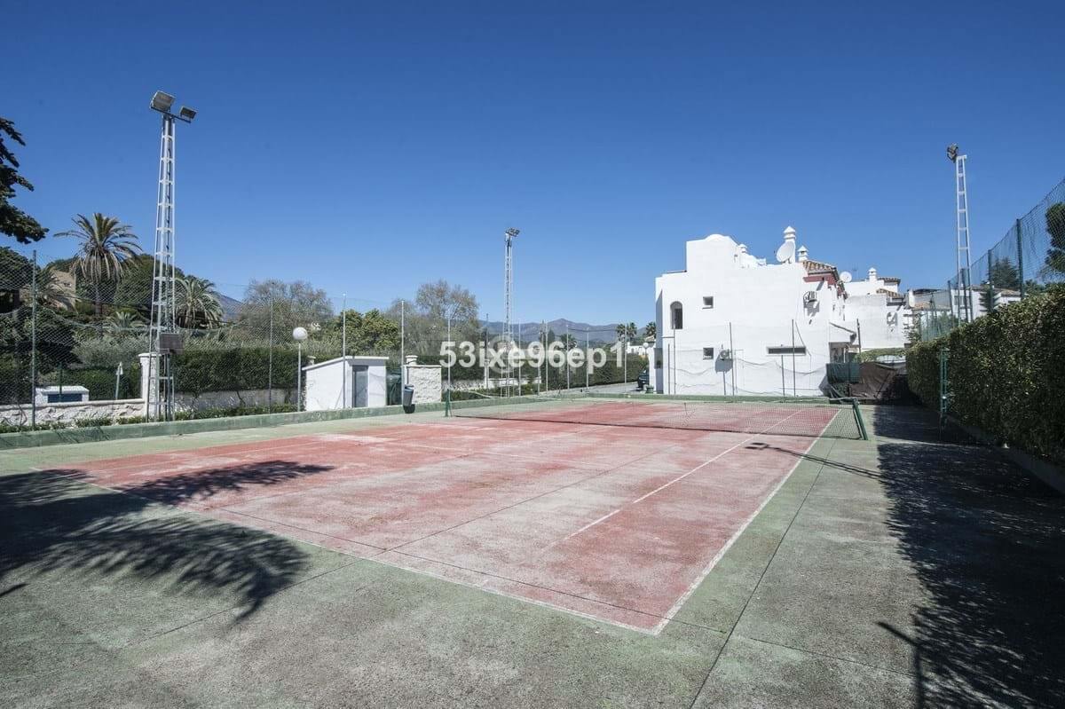 It is part of a well-maintained gated community with tropical gardens, a communal swimming pool, and a tennis court, all in a private and quiet residential setting.