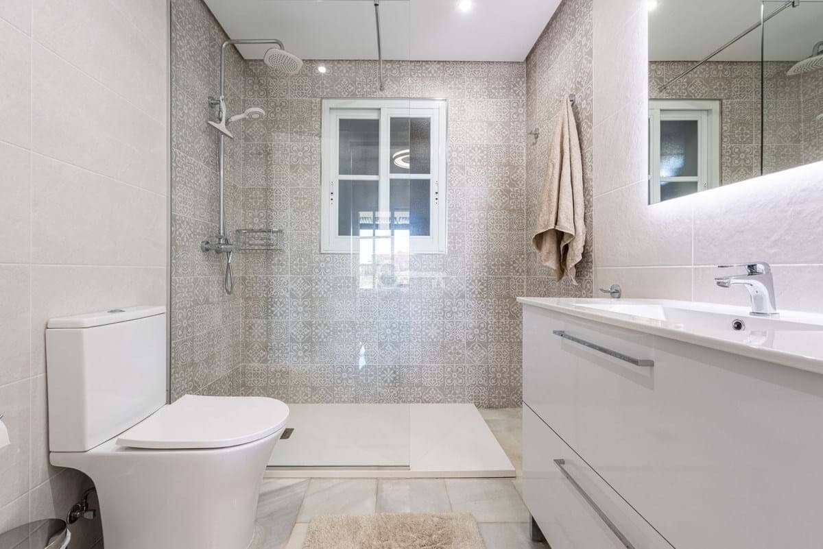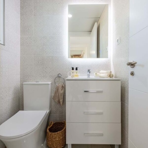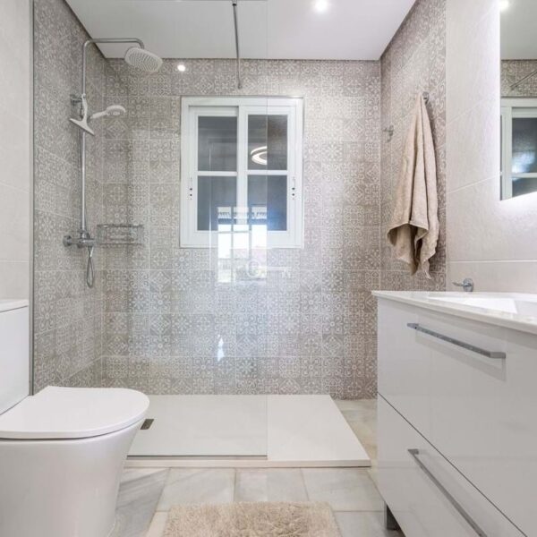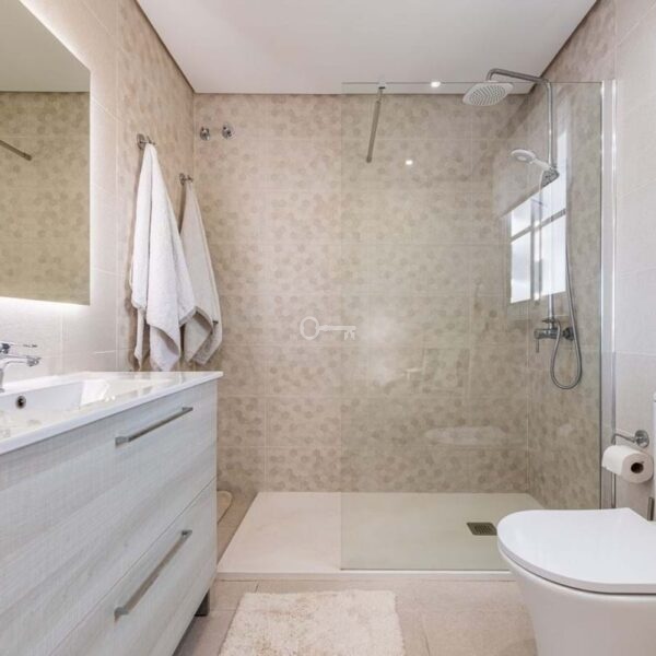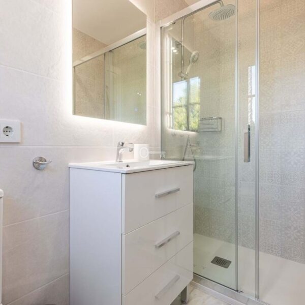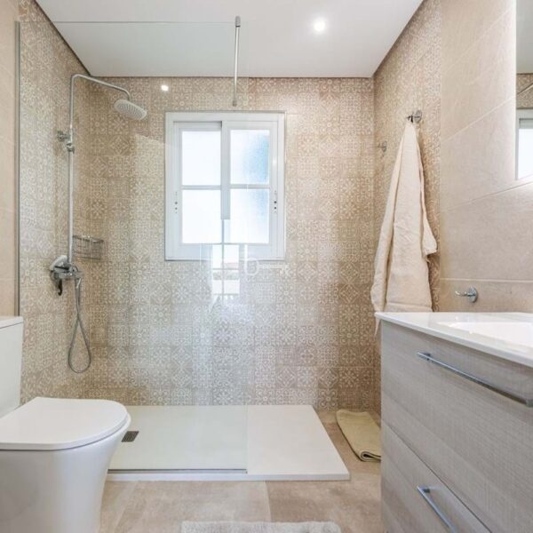 On the first floor, the master bedroom enjoys its own en-suite bathroom, accompanied by two additional guest bedrooms, both with en-suite bathrooms. Two of the bedrooms open onto a sunny terrace, while the living room connects to a large covered terrace with sea views.