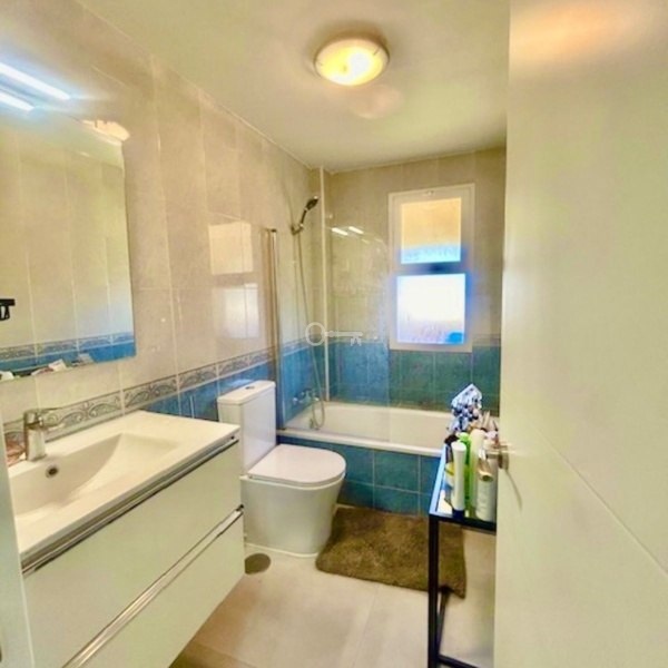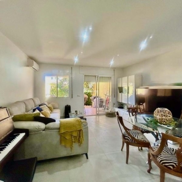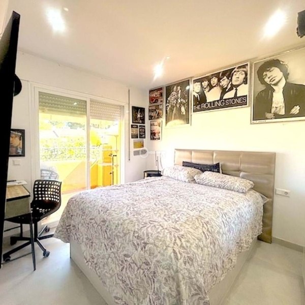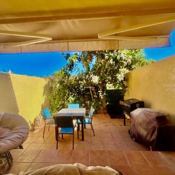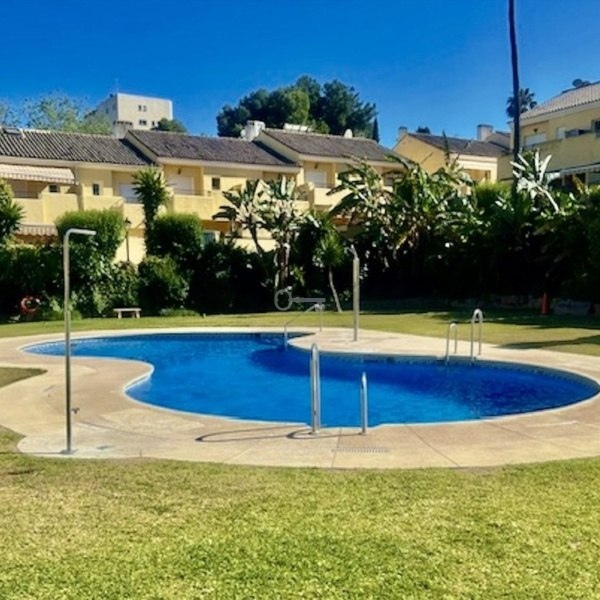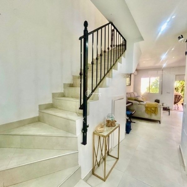 This partly renovated townhouse is situated in a tranquil enclosed urbanisation on the New Golden Mile. At the entrance of the property is a private terrace, entering the house you find a new modern kitchen with a hatch, guest toilet, dining and living room which opens to a good sized terrace with space for a dining table, a couple of sun beds and a bbq. From here is direct access to the pool and the communal gardens. On the upper level are three bedrooms whereas one is ensuite with its own balcony overlooking the pool. The second bedroom which enjoys beautiful mountain views share a full bathroom with the third bedroom. On the roof are solar panels making the electricity costs extremley low. There is the possibility to extend the living area building a basement, enlarge the kitchen and creating another floor on top of the existing upper level. This a an excellent opportunity to invest in a home which is perfect for all year or holiday living, with only a couple of minutes drive to Aldi supermarket and other services. A six minutes drive to the new Laguna Village luxury center, the beach and with easy road access going towards Málaga or Gibraltar!