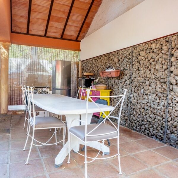 The villa boasts a substantial built area of 484m², thoughtfully arranged to maximise both space and light. The living room is a welcoming haven, seamlessly connected to a covered terrace that invites year-round enjoyment of the beautiful garden and pool views. The fully fitted and equipped kitchen, complemented by a utility room and ample storage, ensures that daily living is as practical as it is stylish. Fitted wardrobes throughout the bedrooms provide generous storage, while air conditioning guarantees comfort in every season.