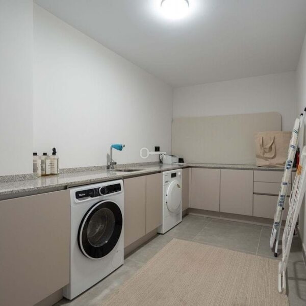Additional highlights include air conditioning, partial underfloor heating, double glazing, electric blinds, security shutters, alarm system, basement, storage and utility rooms, laundry room, fitted wardrobes, and a private garage.