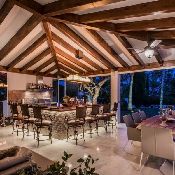 The modern, well-equipped kitchen showcases taupe cabinetry, dark stone countertops, and an island cooktop. An adjacent dining space opens to the gardens, while a separate lounge with exposed wood beams, a bar, and a stone fireplace connects seamlessly to the terrace and pool area. These interiors combine contemporary finishes with classic details, providing both comfort and functionality.