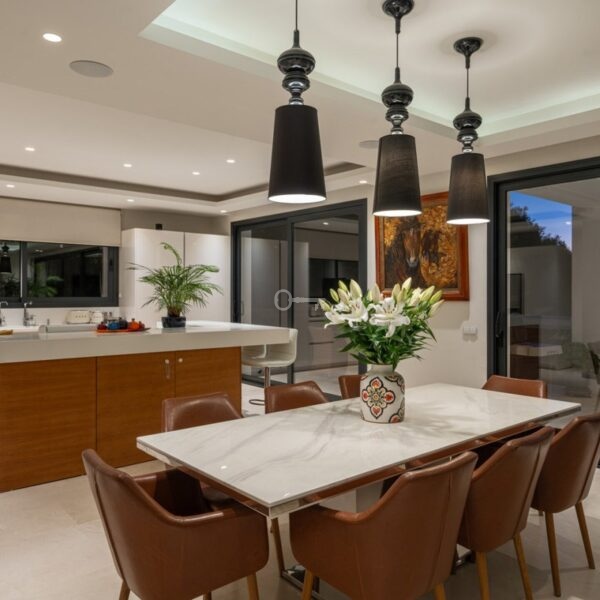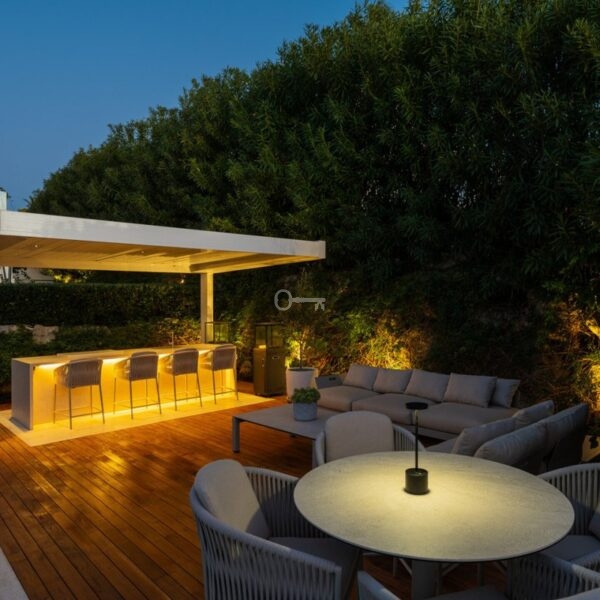 The villa opens onto beautifully landscaped gardens, multiple terraces, a private swimming pool, and a panoramic rooftop solarium, creating a seamless indooroutdoor lifestyle with all-day sun exposure and spectacular sunset views. An elegant bioclimatic pergola with a fully equipped outdoor kitchenette makes alfresco dining and entertaining effortless.