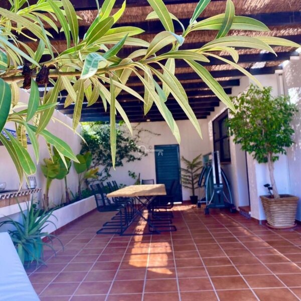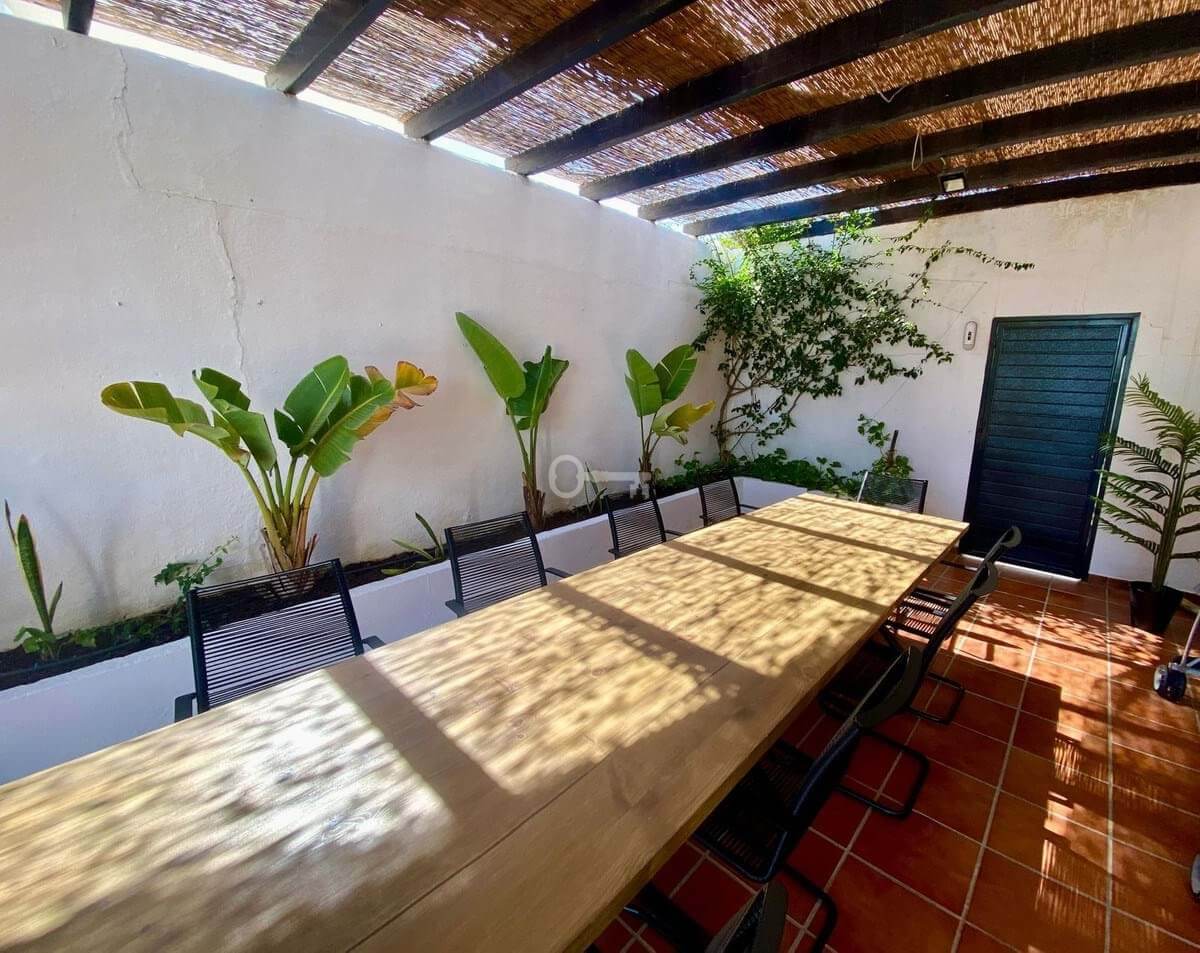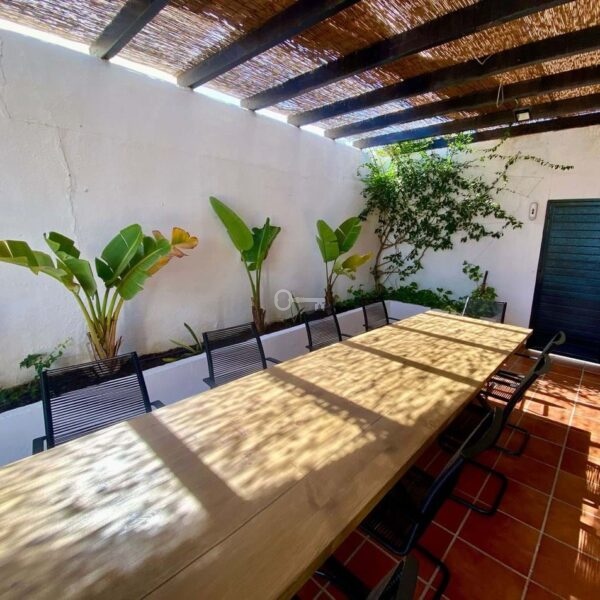The large covered terrace is an ideal spot for alfresco dining and entertaining, featuring a wooden table that seats up to 14 guests. Also featuring a chill out zone with sofa and views to the pool and garden.