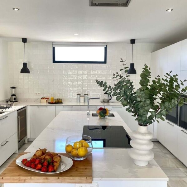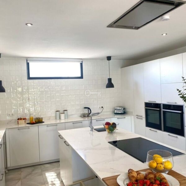 The super modern kitchen boasts sleek white units, an island with bar stools, and all the top-of-the-line appliances needed to prepare delightful meals for your family and guests.