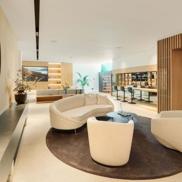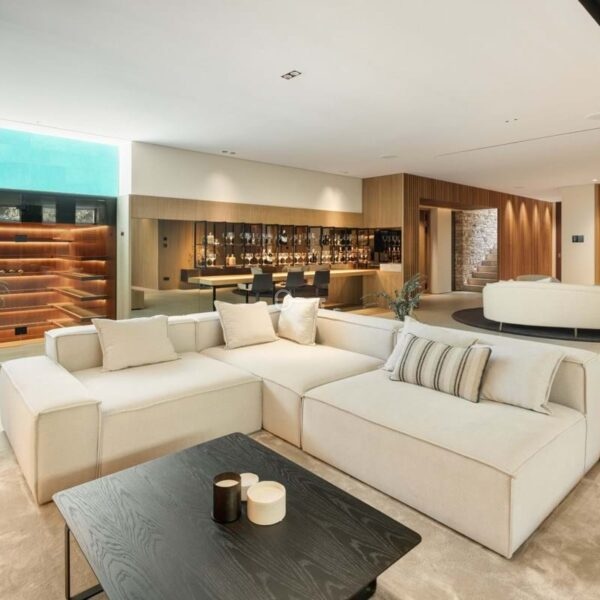 The lower level reveals a dedicated space for leisure and relaxation. A home cinema promises a cinematic experience in luxurious surroundings, while the adjacent bar area is perfect for social gatherings. The pièce de résistance is the spa area, which includes a fully equipped gym, a sauna, and a steam rooma haven of relaxation.