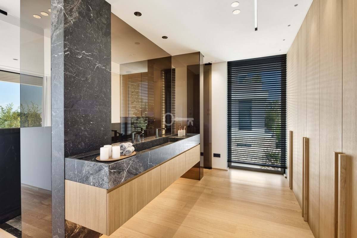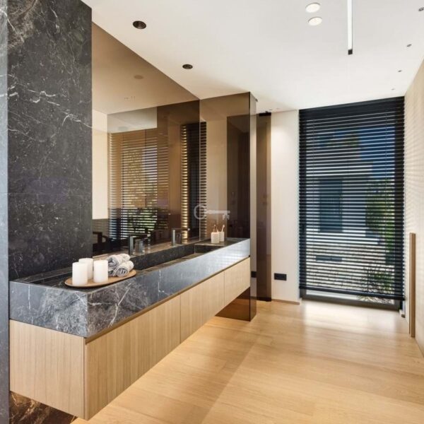 Nestled gracefully upon the verdant slopes of Nueva Andalucía, this villa is a triumph of modern elegance and luxurious design, an embodiment of serene sophistication. As you approach the property, you are greeted by a grand entrance framed by sleek lines and natural stone, leading to a majestic wooden door that hints at the opulence within.