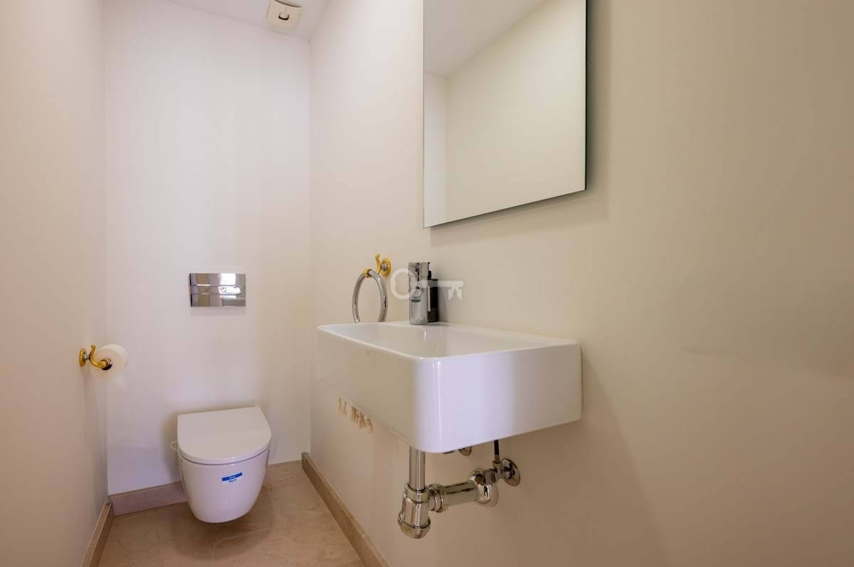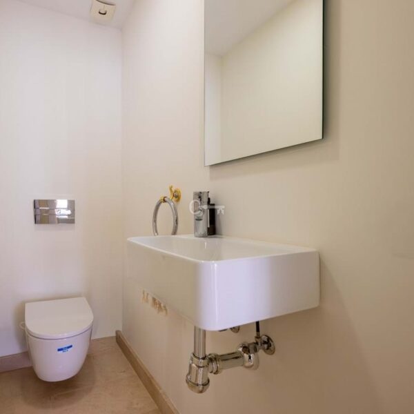 Upstairs, the master suite offers its own generous bathroom and steps out onto a fully private uncovered terrace. The elevated position here noticeably amplifies the already beautiful panoramic views. From here, a staircase leads to the crown of the home: a 30 m² rooftop solarium with far-reaching panoramic views over the Nueva Andalucía golf valley and mountains, a space made for sundowners and long Mediterranean evenings.