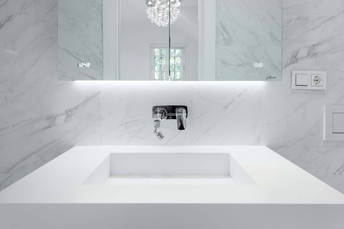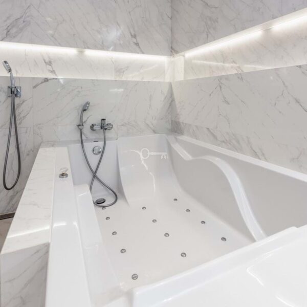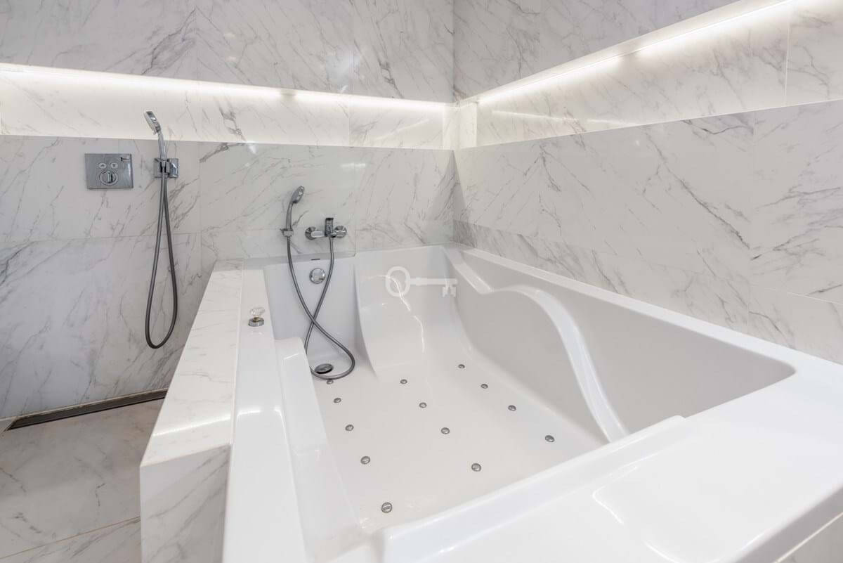 The master suite includes a custom-designed walk-in wardrobe and a luxurious en-suite bathroom with a stunning two-person bathtub. All bathrooms are fitted with high-end Villeroy & Boch fixtures and fittings. Two additional double bedrooms, both with en-suite bathrooms, complete the property.