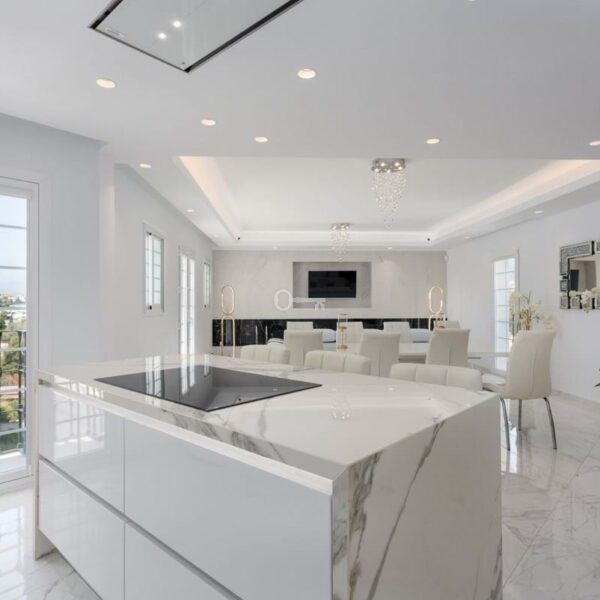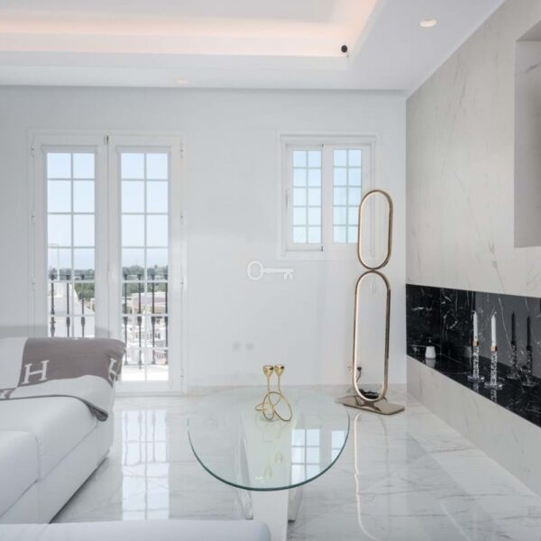 With its west-facing orientation, the property enjoys spectacular uninterrupted views of the golf course, mountains, and the Mediterranean Sea, especially from the impressive 100 m² solarium. The solarium is pre-installed with water and electricity, allowing for the installation of an outdoor kitchen and pergola to create a shaded lounge or rooftop entertaining area.