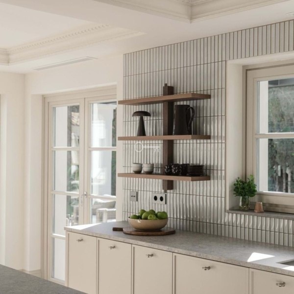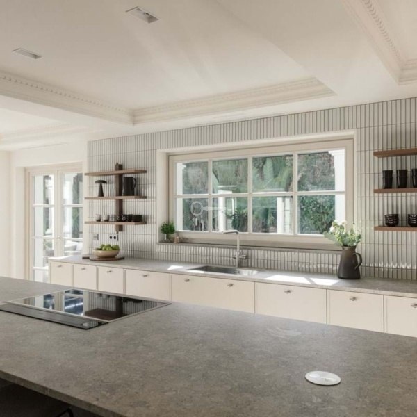 At the heart of the home is a beautifully tailored kitchen, marrying functionality with high-end design. The open-plan living and dining area is a masterclass in contemporary interior design, featuring curated furnishings, a soothing neutral palette, and warm wooden details. High ceilings and direct access to the terrace enhance the indoor-outdoor flow, infusing the space with natural light and an airy ambiance.