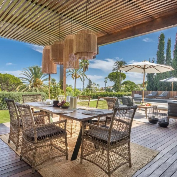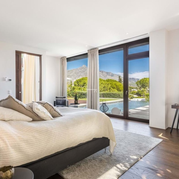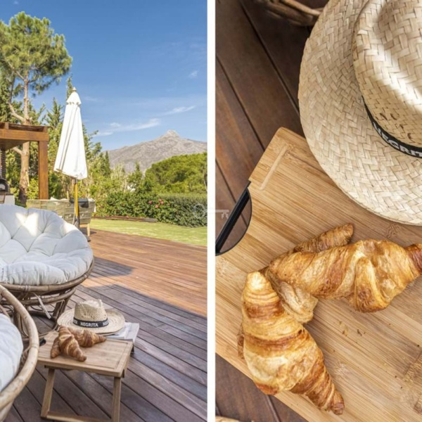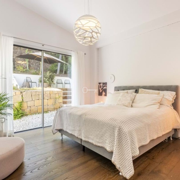 This totally refurbished villa on a very private plot is situated in the heart of Las Brisas and a short drive to the Los Naranjos Golf course, on an elevated south facing plot offering magical mountain & sea views. This property is perfect for families and golfers and for anyone that is looking for that special architectural experience. Offering a unique style and feeling to all other villas on the market with high vaulted ceilings in wood, modern windows, and curated decor. On the main level you have the master suite, 2 large guestroom suites and the Danespan/Puroform custom designed kitchen which naturally flows into the open plan dining room living room. On the lower level a light filled entrance hall leads to the state-of-the-art home cinema and a spacious multifunctional room comprising of gym exercise machines and pool table with access to the shaded courtyard. There are 2 additional bedrooms also with access to the internal courtyard and the 3rd room which can also be an office or an extra bedroom. The pool area is a tropical haven with its outdoor kitchen, pizza oven and spa style swimming pool. The villa also offers garage, underfloor heating/AC throughout and recently upgraded security features such as complete external HD CCTV coverage and door entry system.