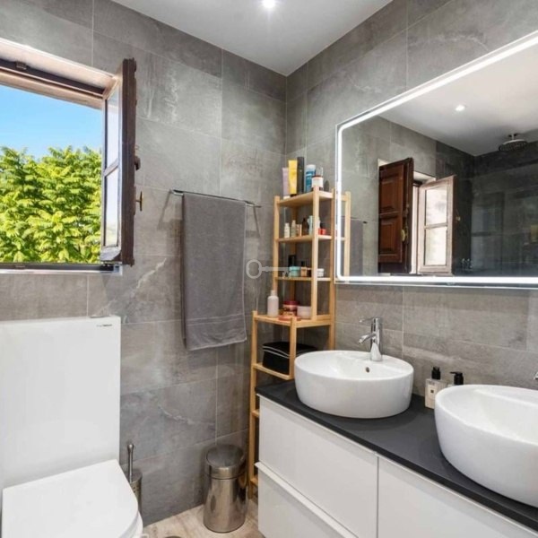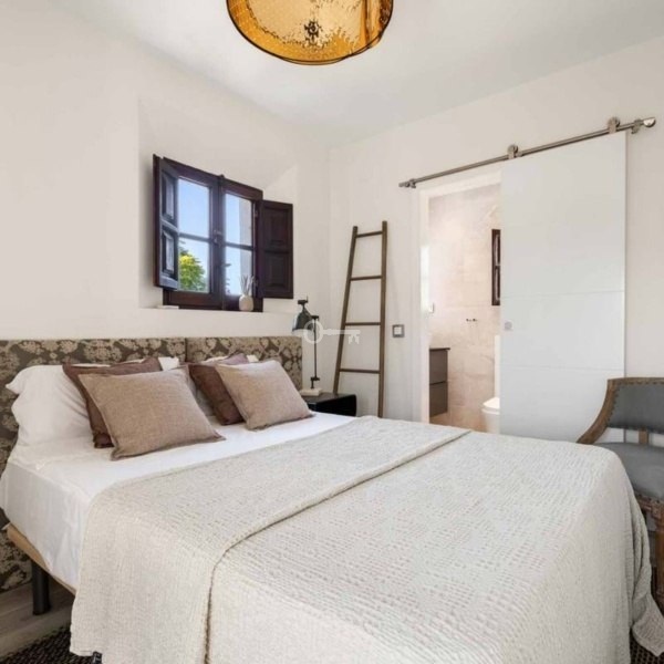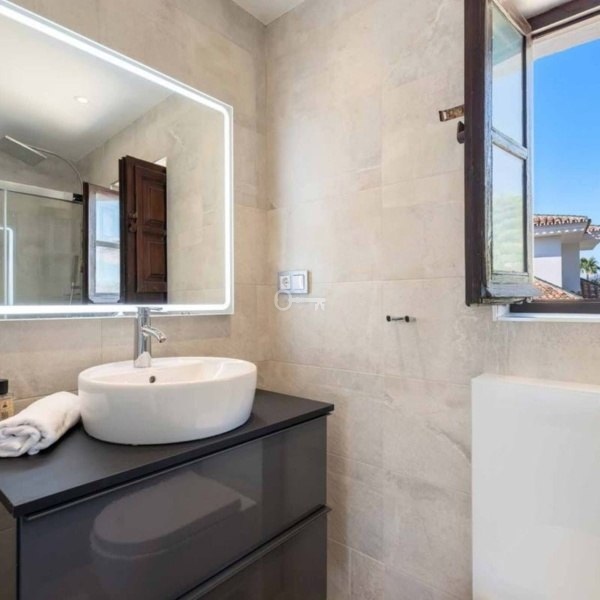 The home has been thoughtfully updated, blending Andalusian charm with modern comfort. The ground floor offers an open-plan living and dining area with a fireplace and direct access to a private terrace framed by Mediterranean greenery. A refurbished kitchen with contemporary finishes connects seamlessly to the living space, creating a functional and inviting layout.