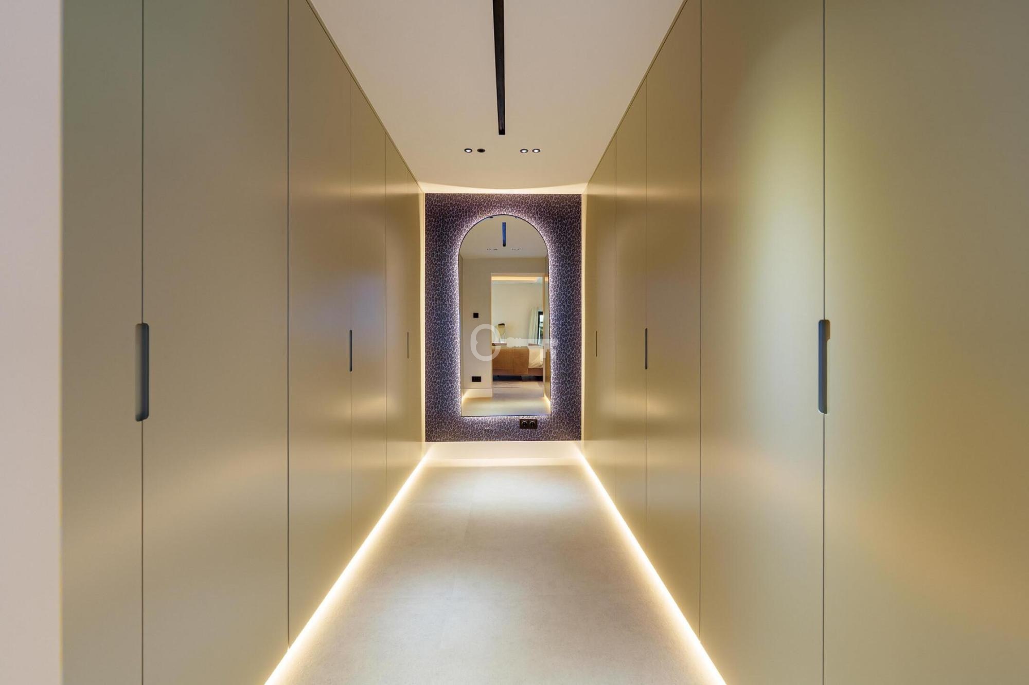 Bright, open-plan interiors are designed in a minimalist style with warm, natural accents. The living room with fireplace flows seamlessly into the fully equipped kitchen and dining area, with large windows bringing in plenty of natural light. The master suite opens directly onto the terrace and pool, while the luxurious bathroom with a freestanding bathtub and walk-in shower highlights the villa’s exceptional character.