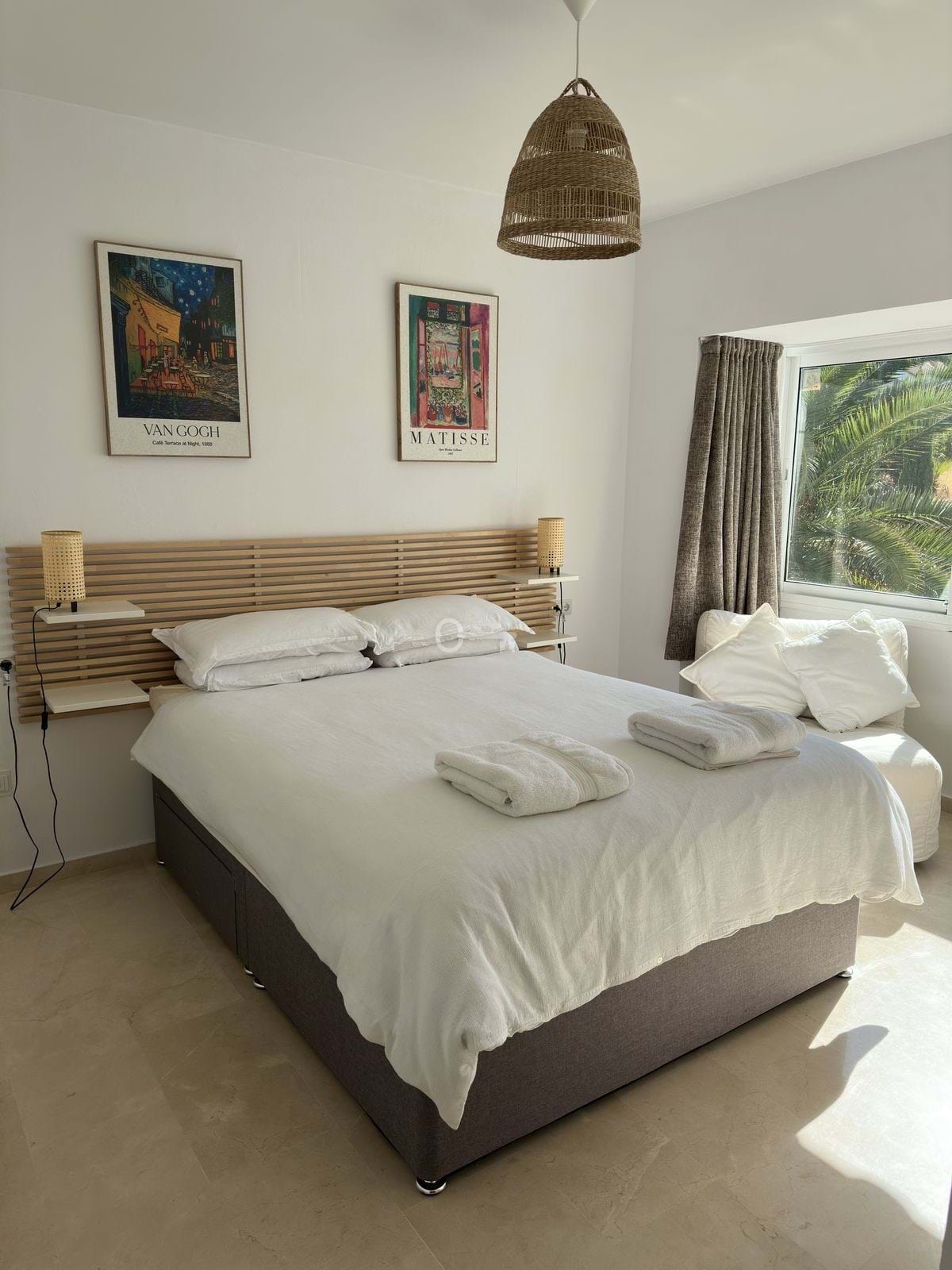 The sun soaked private garden has 2 terraces which lead to a lawned area with mature palm trees – all maintained by the community gardeners.