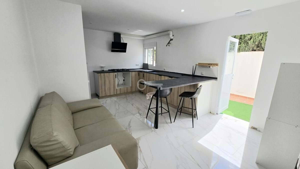 This property is an independant villa with a clever conversion. Fully reformed 2 bed 2 bath apartment with sea views on the properties first level. Enter the property to a large outside wrap around terrace area, great for relaxing with seating areas. Enter the apartment and you are met with a bright Tastefully renovated space with sea views from a large deliberatly designed double glazed window, good sized living area with open plan kitchen, modern appliances, good sized uttility area, uniformed flooring through out.