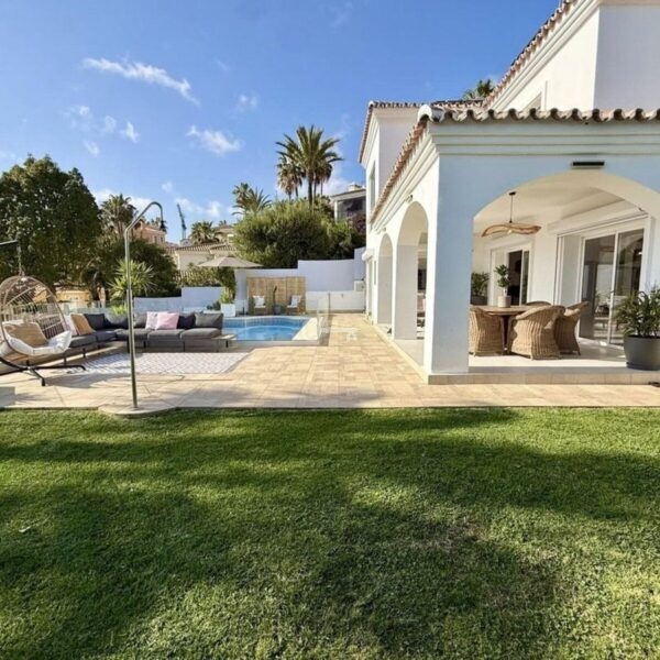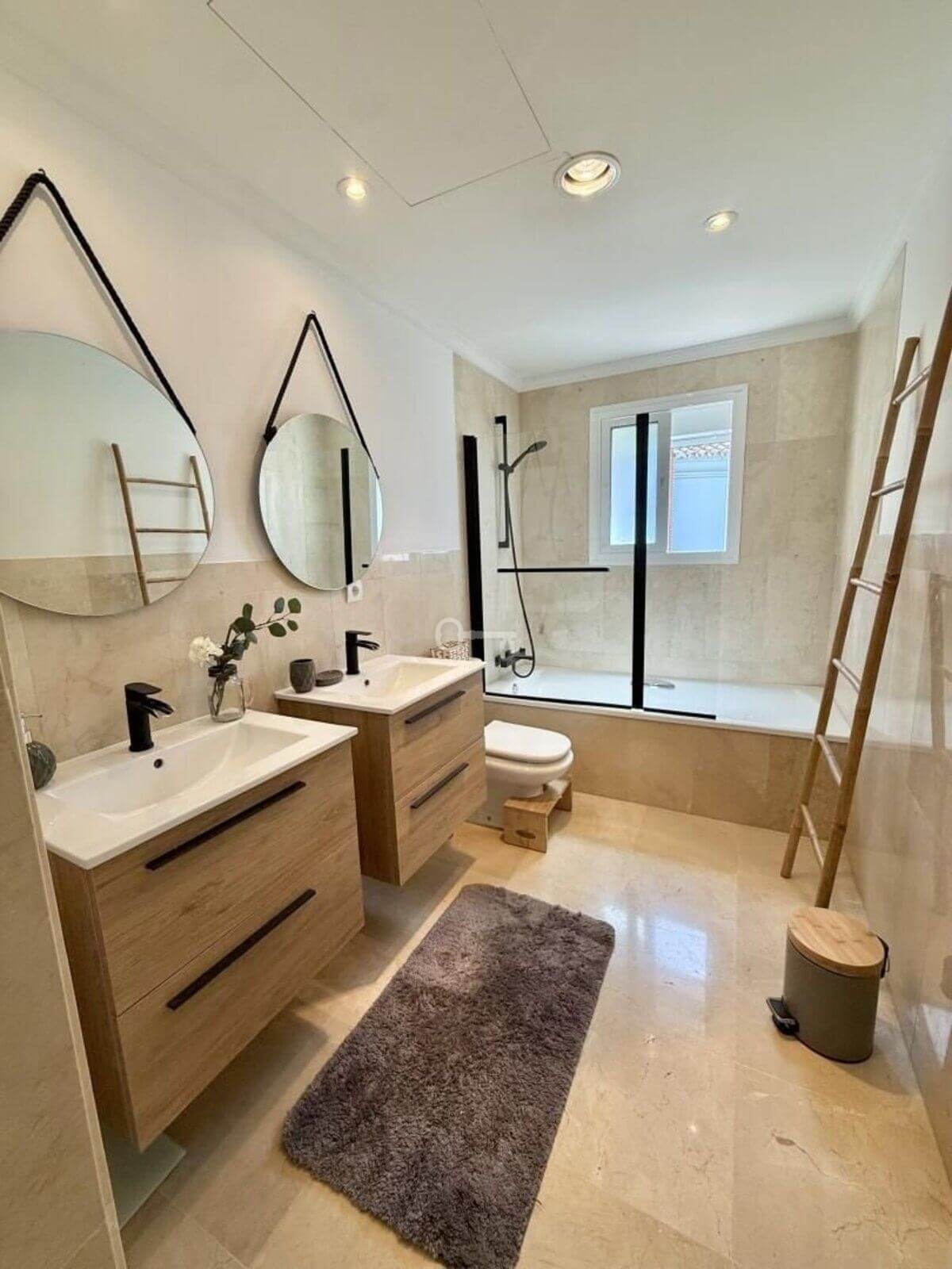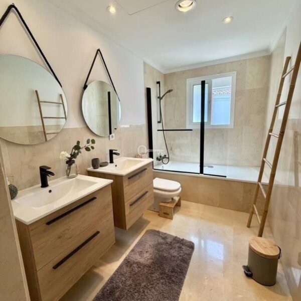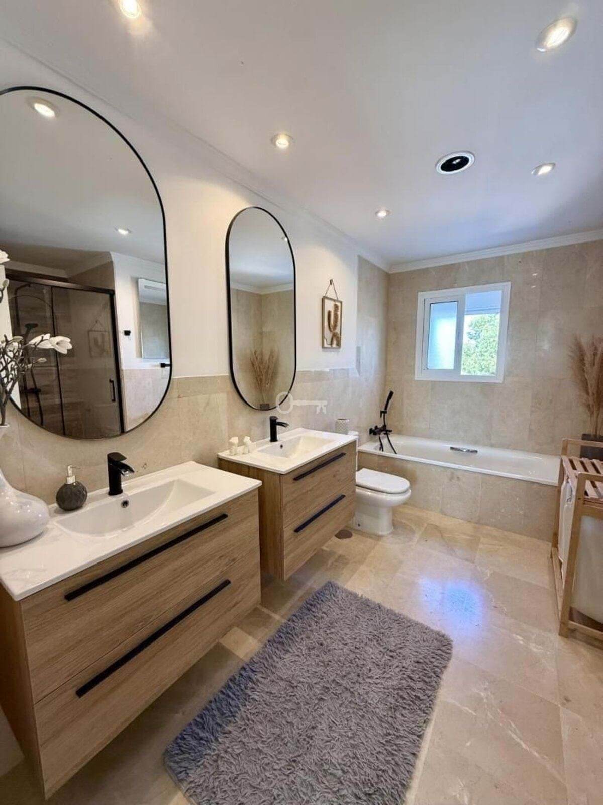 Upstairs, three bedrooms and two fully renovated bathrooms, including a master suite with en-suite bathroom and an additional den enjoying views of Miraflores Golf and the sea.