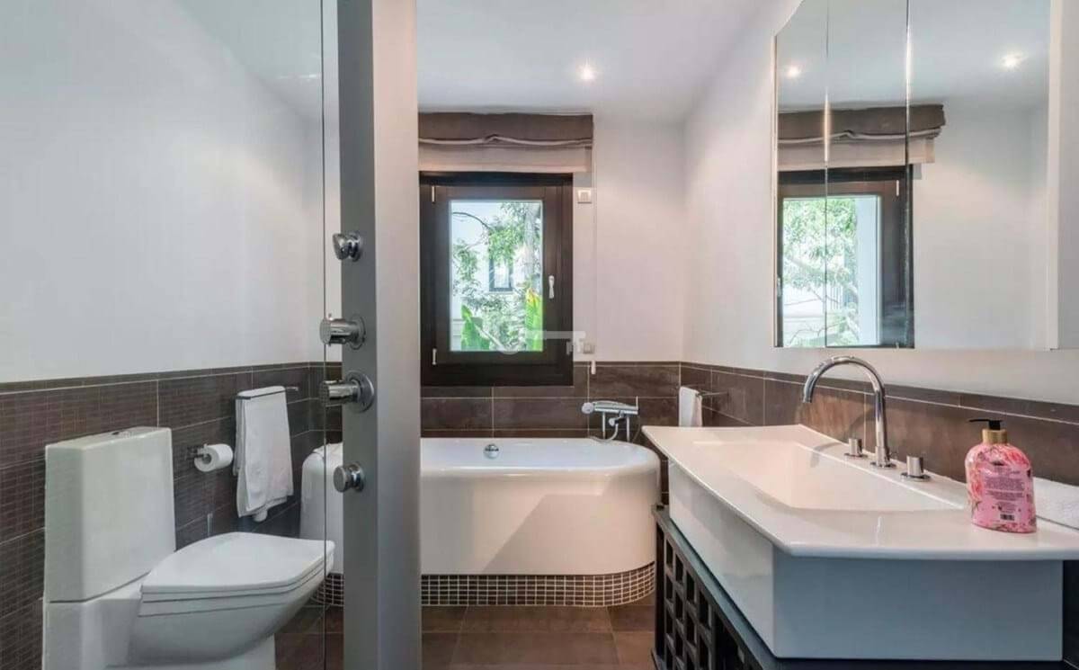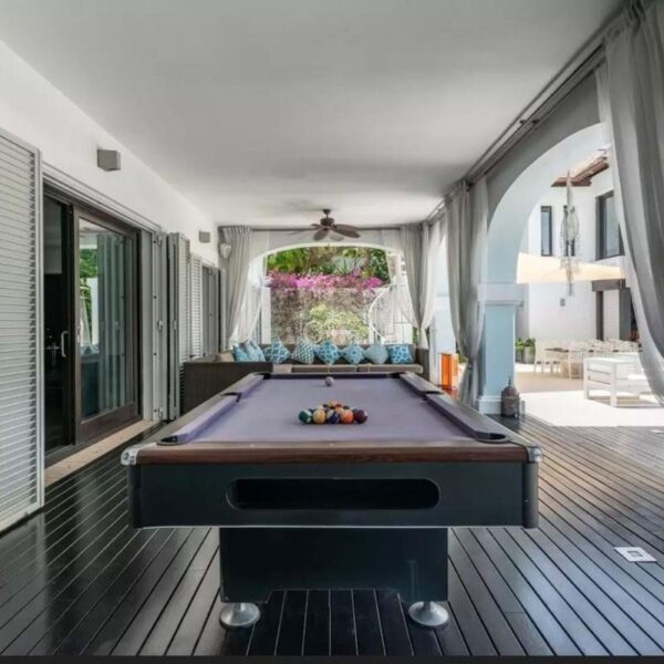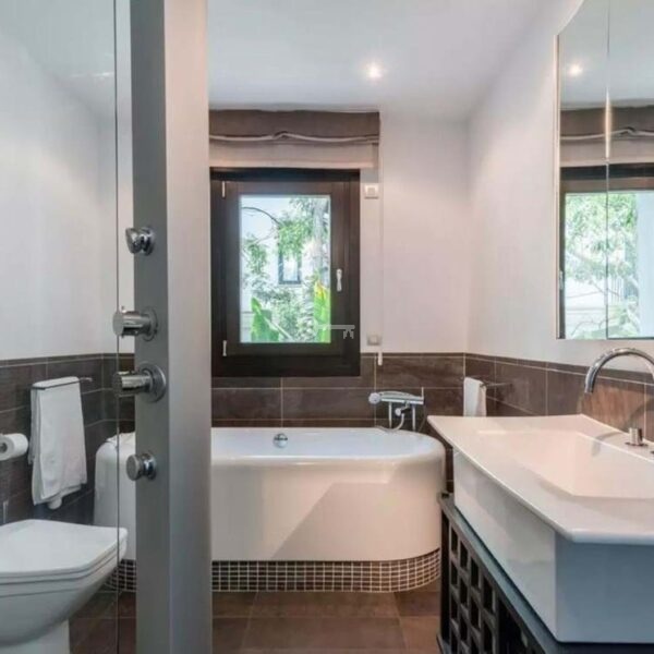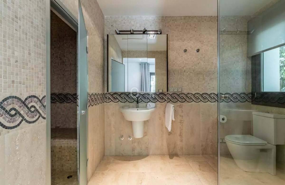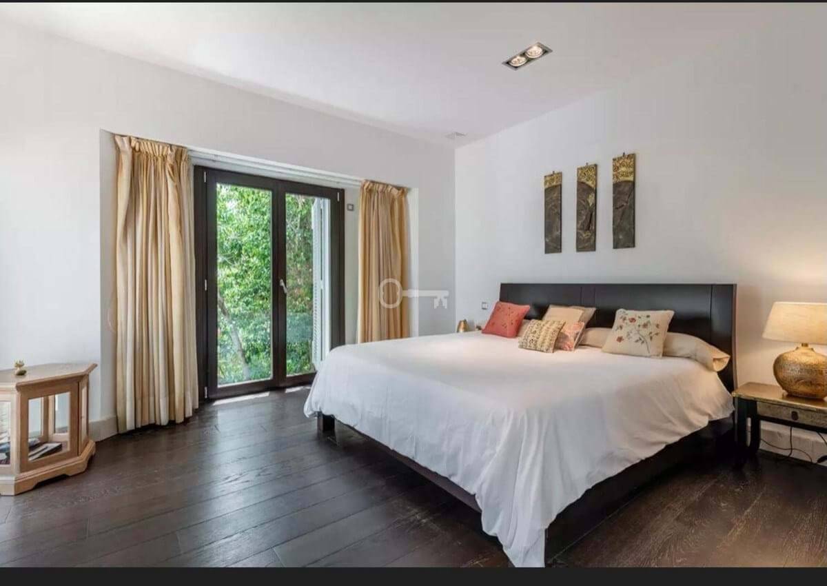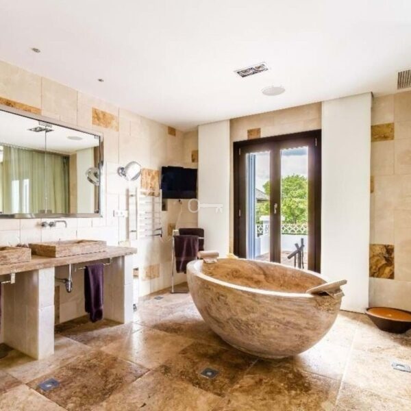 Built with high-quality materials, the property includes Tino marble, Iroko wood flooring, a fully equipped Miele kitchen, and designer staircases and entrance doors created by artist Sebastián Fisher. The villa is equipped with underfloor heating throughout, individual air conditioning, and a SONOS sound system.