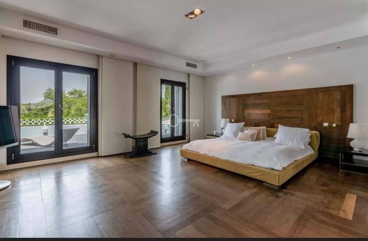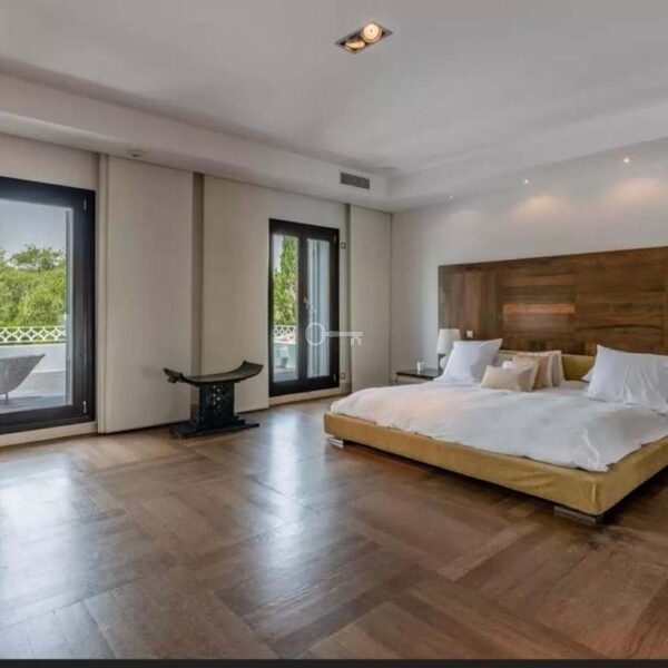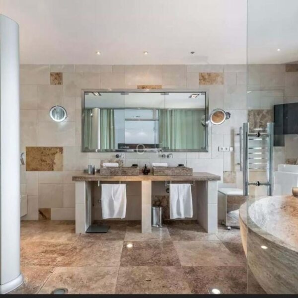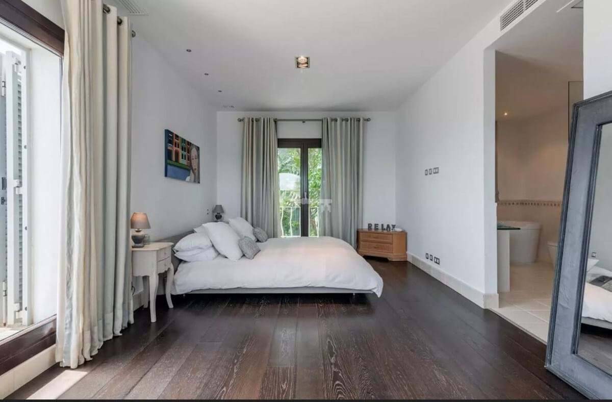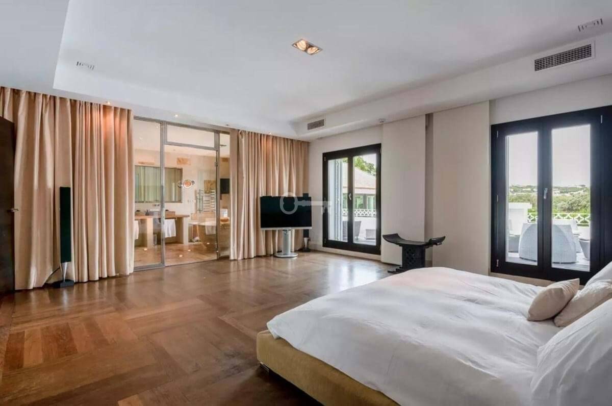 The villa spans three levels and features five elegant en-suite bedrooms, along with a small staff apartment on the lower ground floor, with its own kitchen and bathroom. The impressive master bedroom features a walk-in dressing room, an en-suite bathroom with bathtub and shower, and a private terrace with views of the golf course, swimming pool, and gardens.