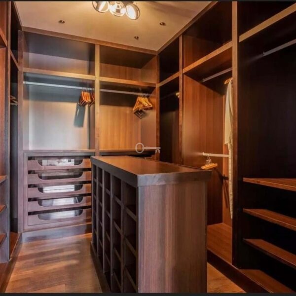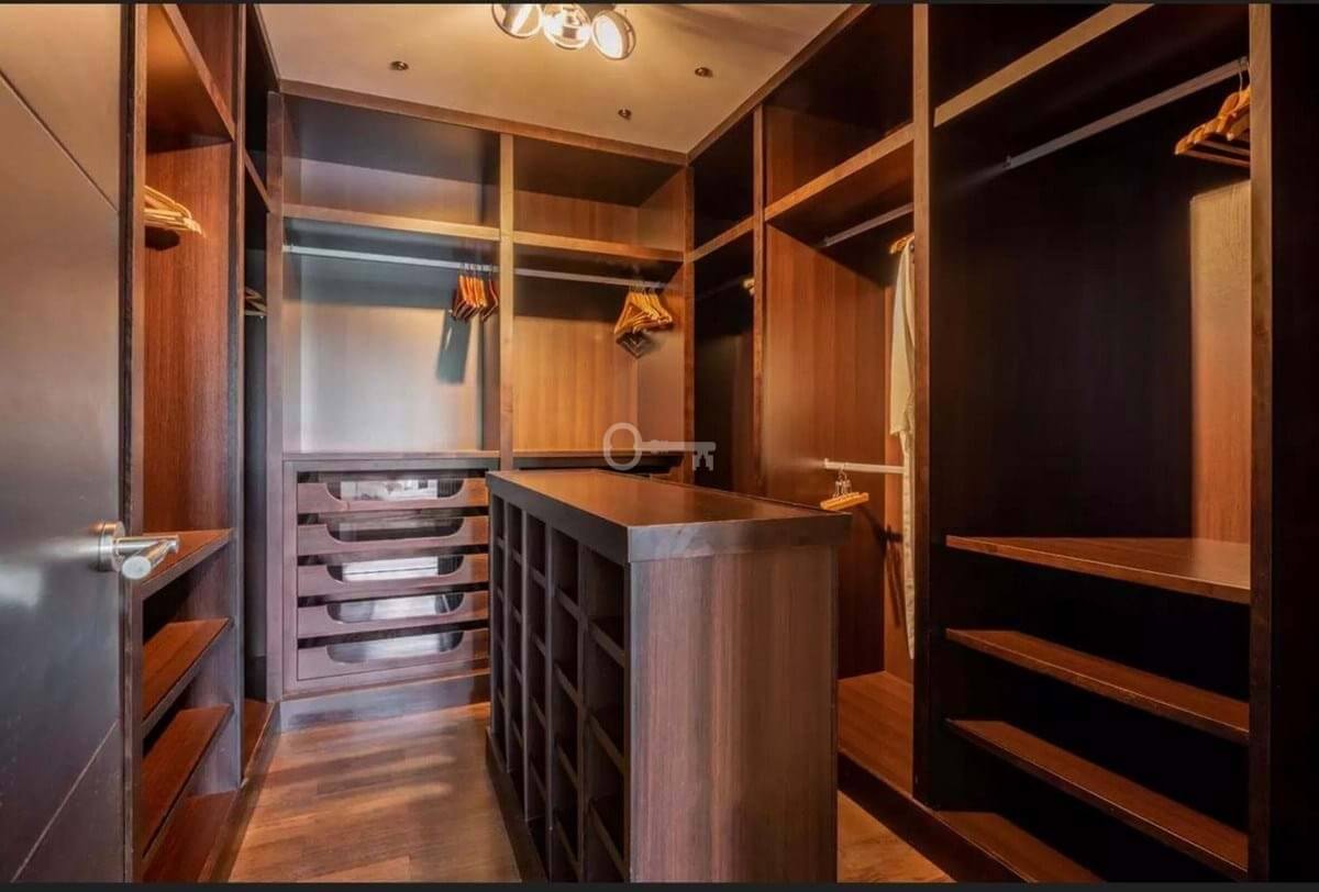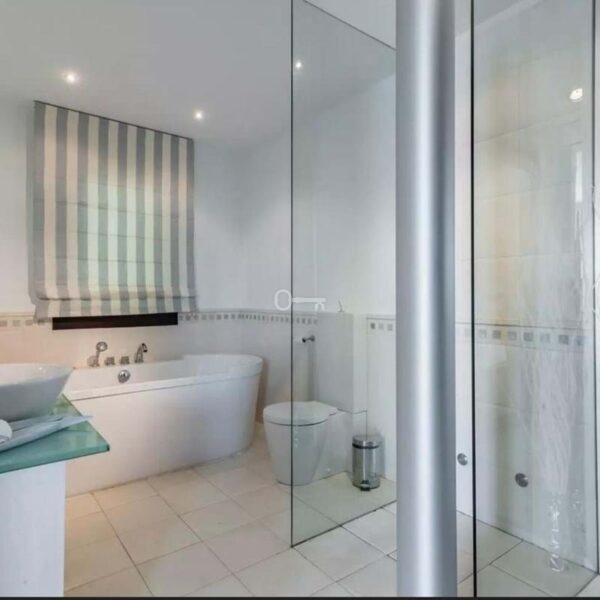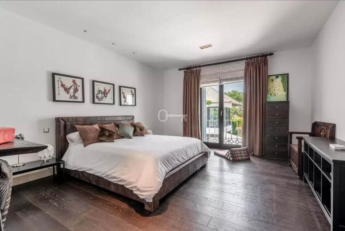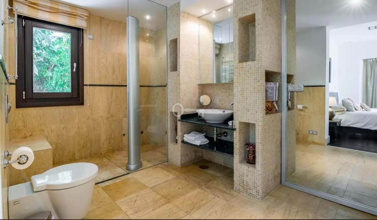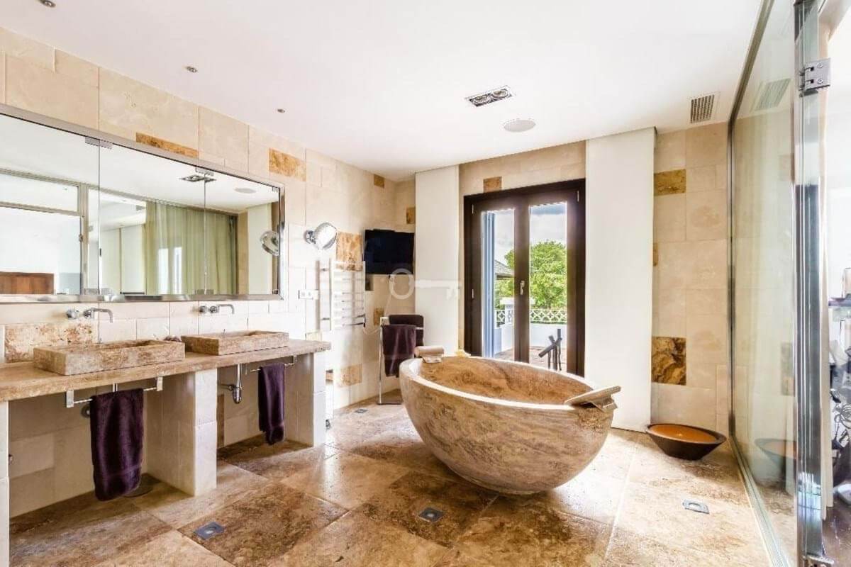The villa spans three levels and features five elegant en-suite bedrooms, along with a small staff apartment on the lower ground floor, with its own kitchen and bathroom. The impressive master bedroom features a walk-in dressing room, an en-suite bathroom with bathtub and shower, and a private terrace with views of the golf course, swimming pool, and gardens.