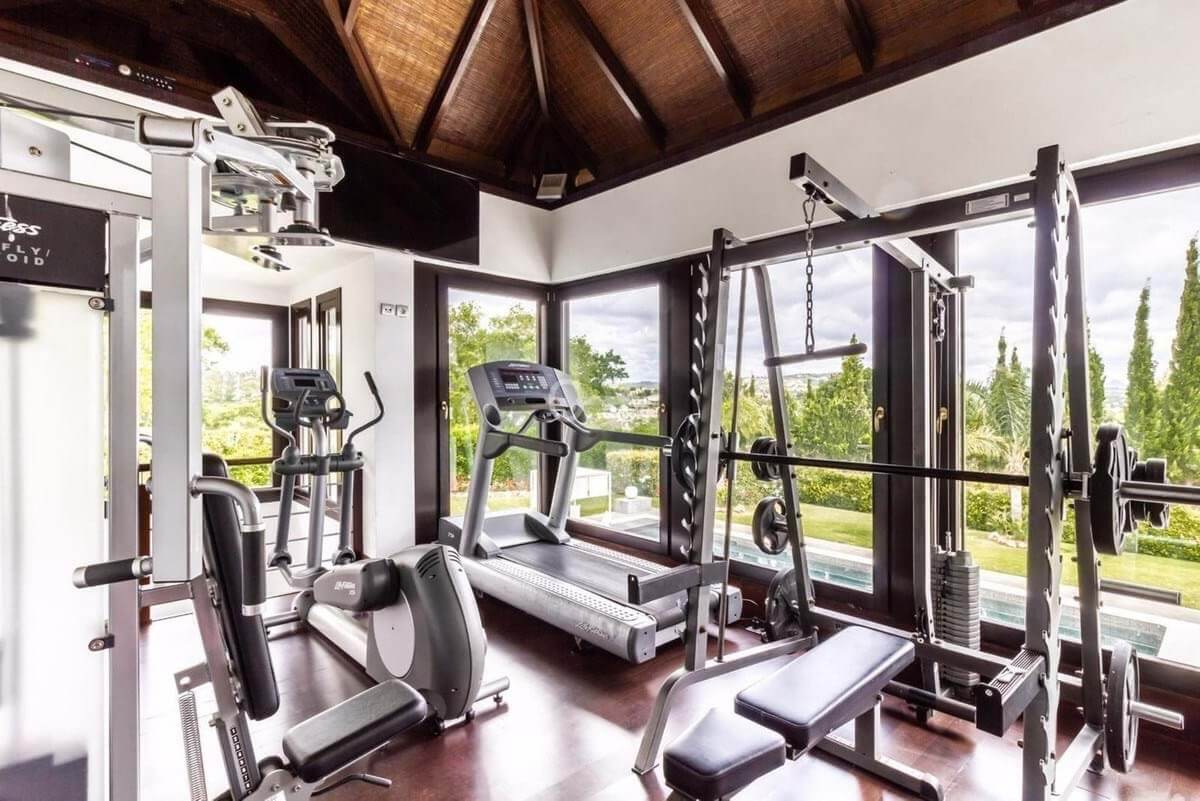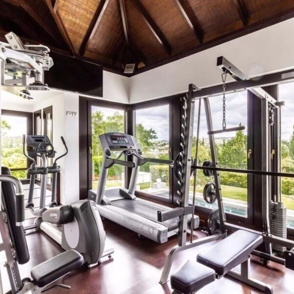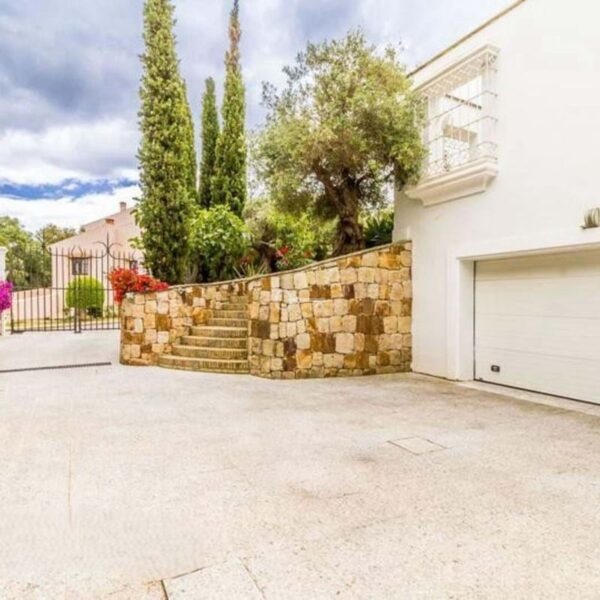 The beautifully landscaped gardens feature mature olive and fruit trees, while the entrance courtyard welcomes you with a soothing fountain. The outdoor areas also include a charming chill-out space and a large 12-meter swimming pool. A separate building on the plot has been used as a private gym.