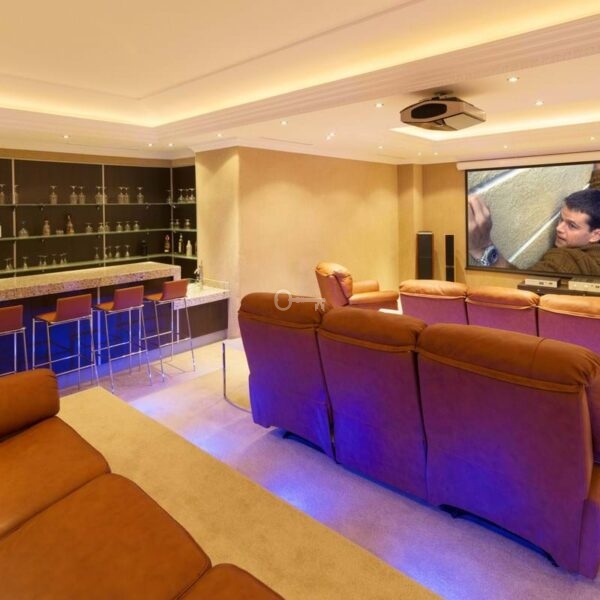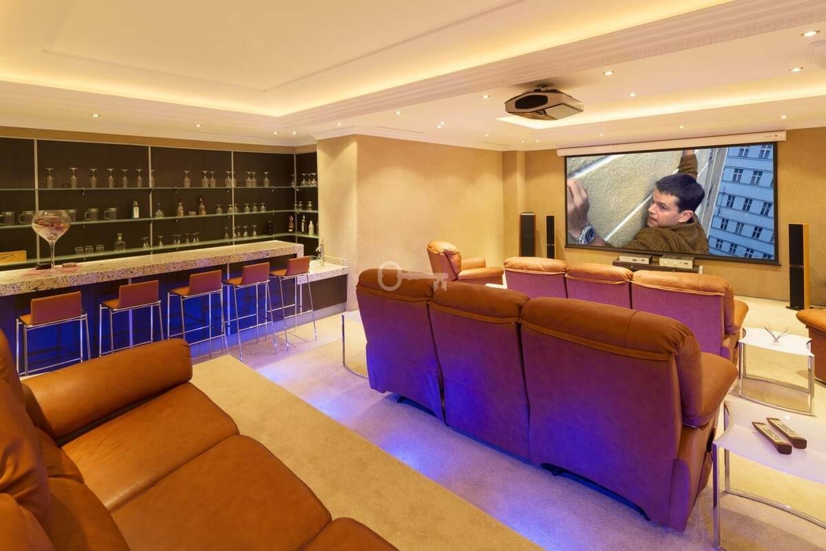 cinema and bar entertainment area with 9 Italian leather recliner armchairs