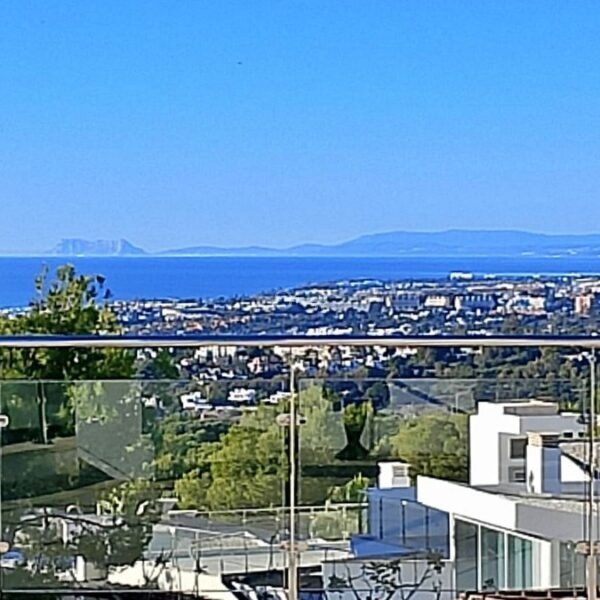 On the first floor, the master suite boasts stunning vistas of the sea and Gibraltar, complemented by a luxurious bathroom featuring a Jacuzzi, shower, and dual vanities. Two additional bedrooms, each with en-suite bathrooms, complete this level.