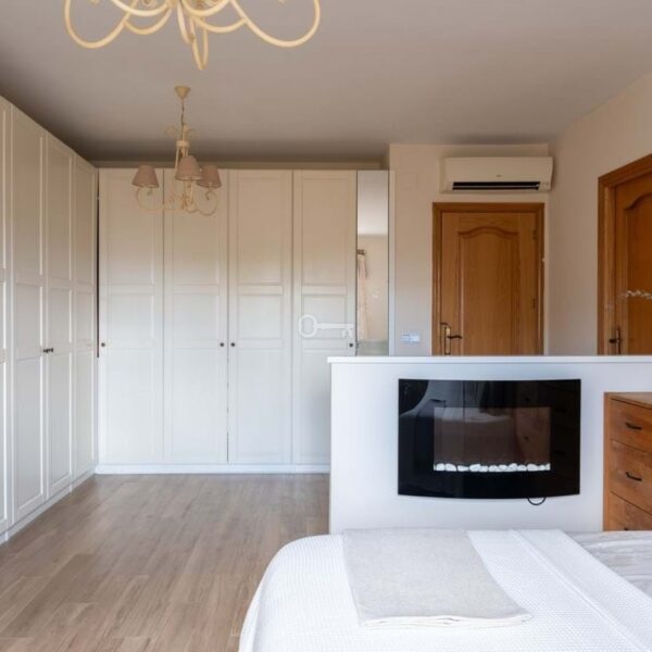 The house is thoughtfully arranged over two levels, with the upper floor forming the social and representative heart of the home. The main entrance opens into a welcoming hallway with a guest WC. From here, you step into a bright and inviting living room, where a fireplace adds warmth and character, and glass doors open seamlessly onto one of the terraces, overlooking the surrounding residential area. At the centre of this floor lies a spacious kitchen with an adjoining dining area, perfectly suited for both everyday family life and larger social gatherings. Through double doors, the kitchen connects to a second living room located at the opposite end of the house, offering direct access to the outdoor areas and swimming pool. A second fireplace enhances the cosy ambiance of this space.