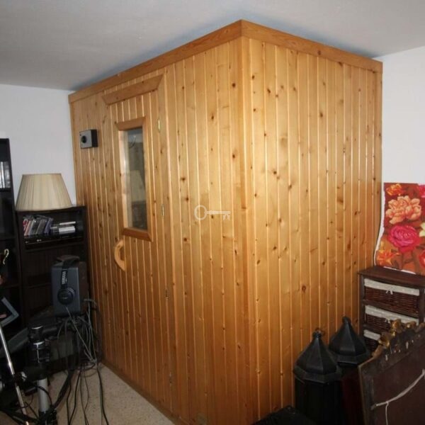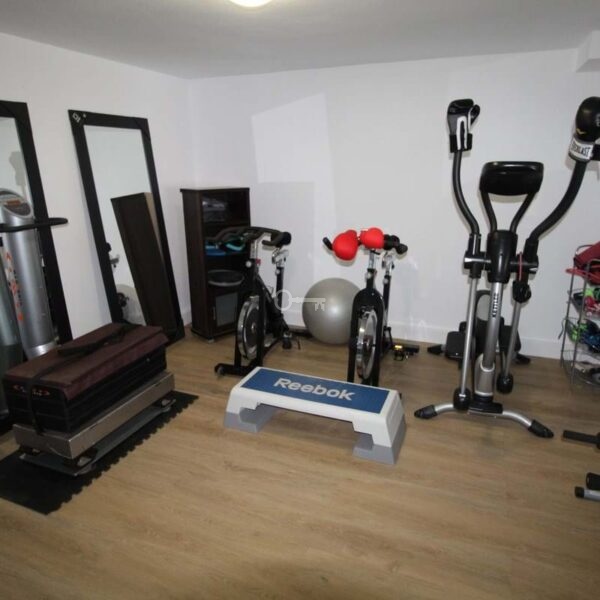 In the basement is the garage with space for two cars, a gym and a large room with a sauna!