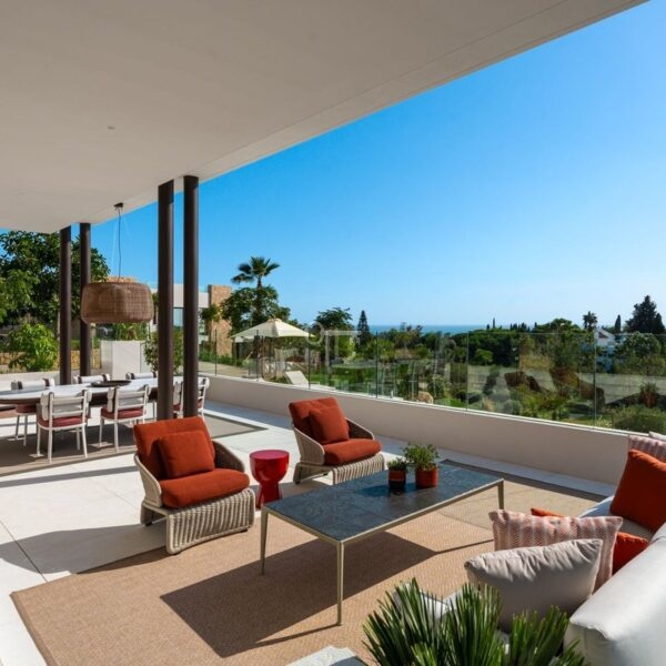 The upper level is reserved for the primary suite, complete with walk-in dressing room, luxurious bathroom, and terrace with panoramic views. An additional guest suite and serene home office complete this floor, all connected by an elevator. This residence epitomizes the highest standard of Marbella living, where contemporary design meets natural elegance.