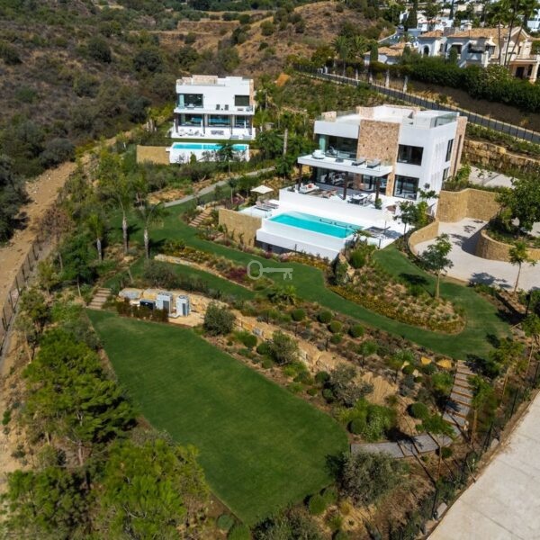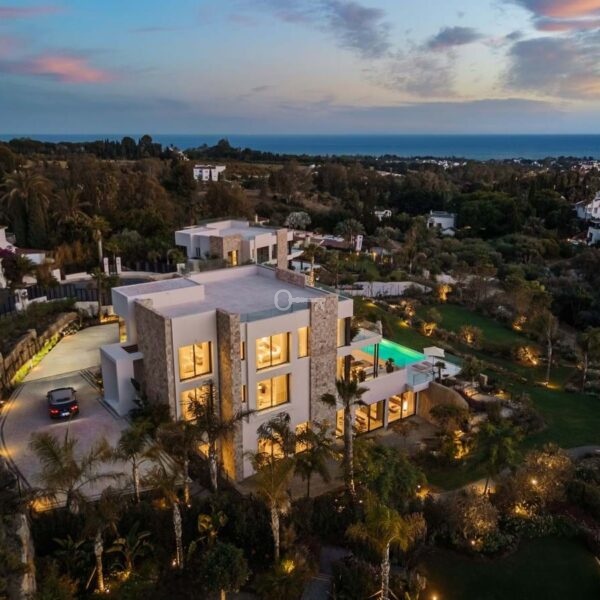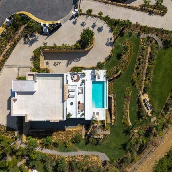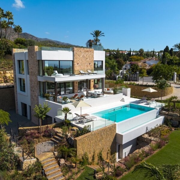This outstanding contemporary residence, situated in the prestigious Marbella Hill Club just moments from the Golden Mile, embodies modern sophistication and architectural excellence. Designed by Villaroel and built by B Solis, it harmoniously combines natural stone, glass, and geometric precision across three levels, surrounded by lush gardens curated by Esspora. The result is a serene retreat that balances privacy, openness, and scenic beauty.