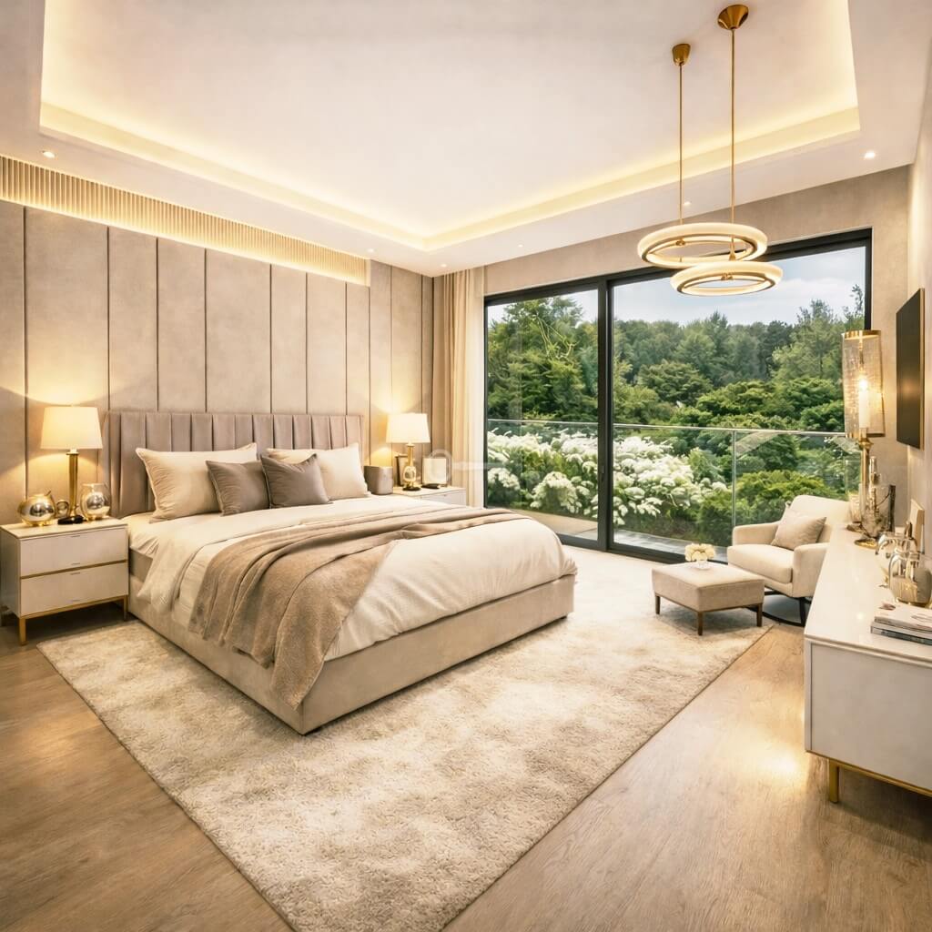 * Master bedroom with wardrobe and bathroom,