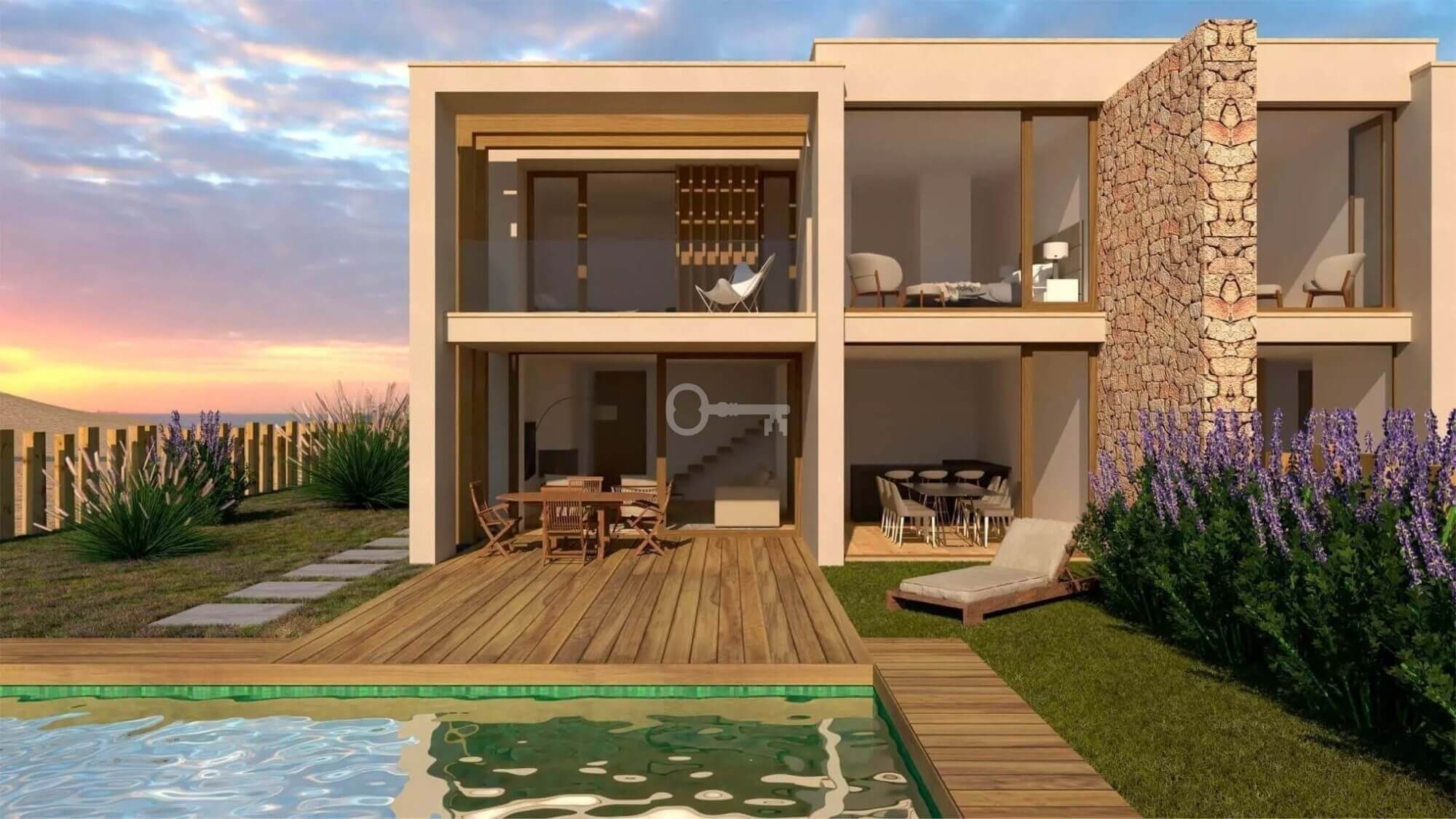 Duplex villa with 3 bedrooms and 3 bathrooms en suite. The fully equipped kitchen connects to a beautiful living room that enjoys natural light, overlooking the golf course and/or the Atlantic Ocean. Each property has its own private garden with swimming pool, electric gate with parking for 2 cars.