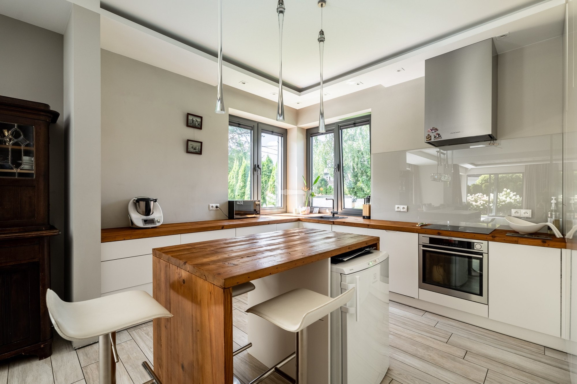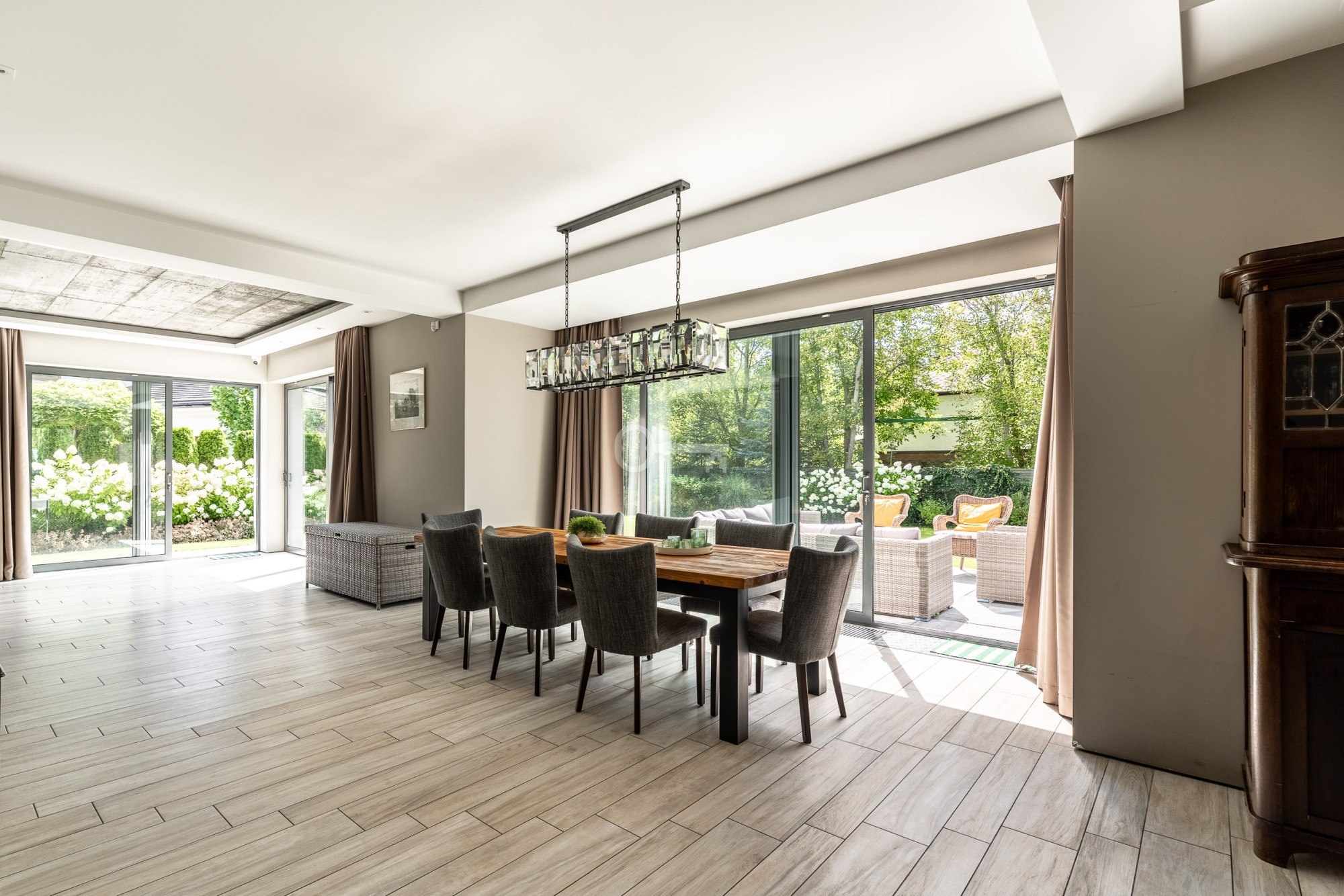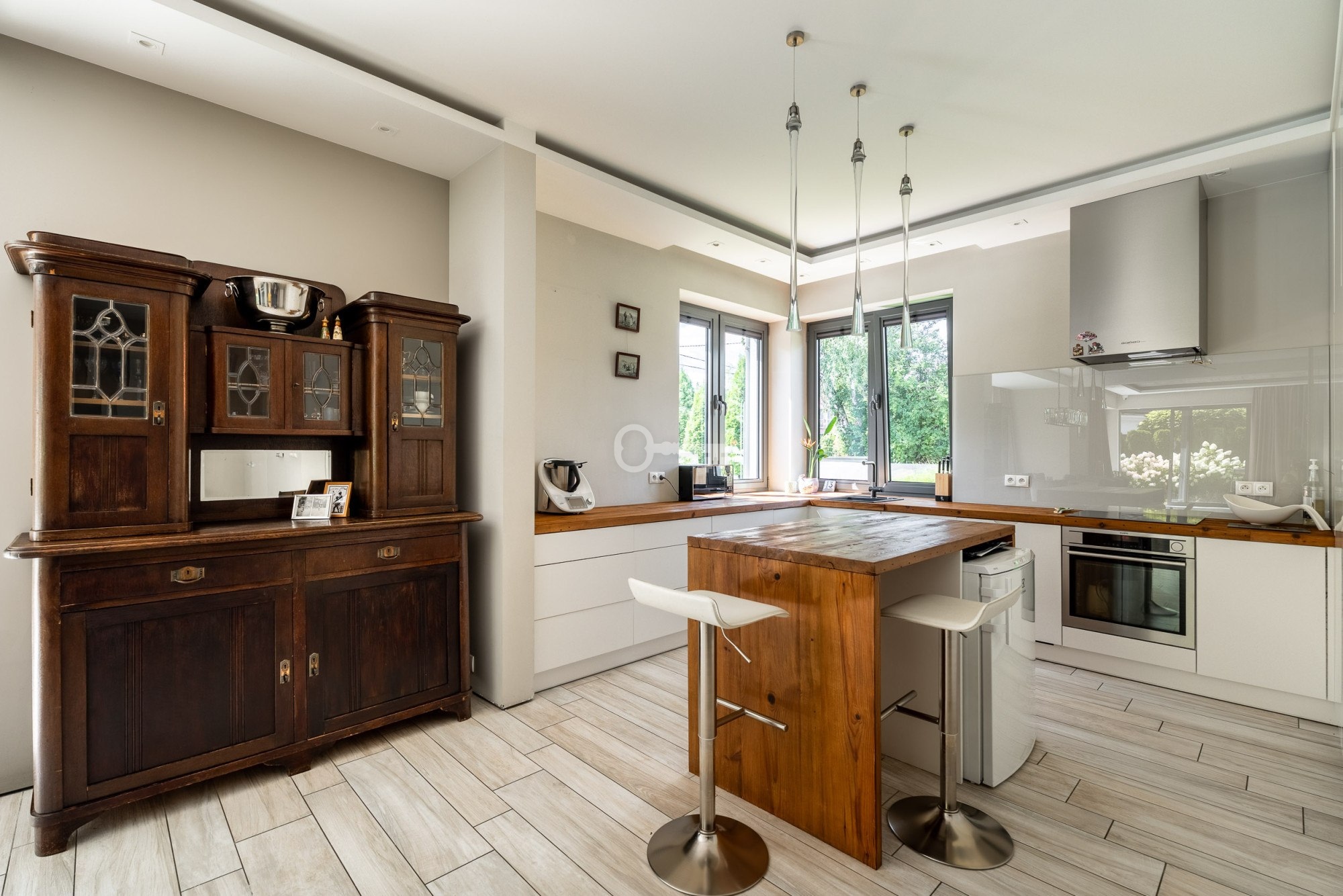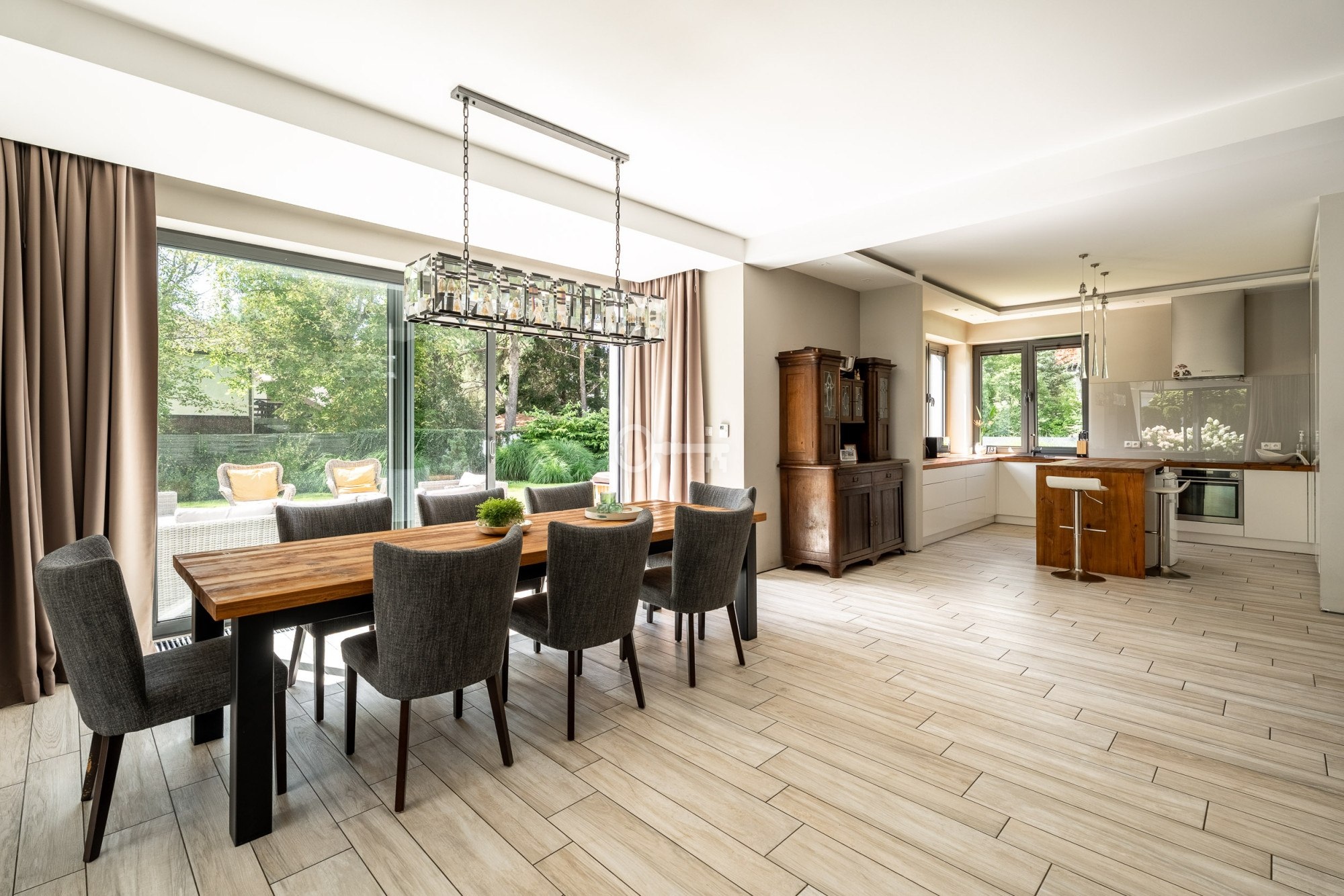 The floor is finished with tiles imitating wooden planks thanks to which there is underfloor heating in the living room, dining room and kitchen.