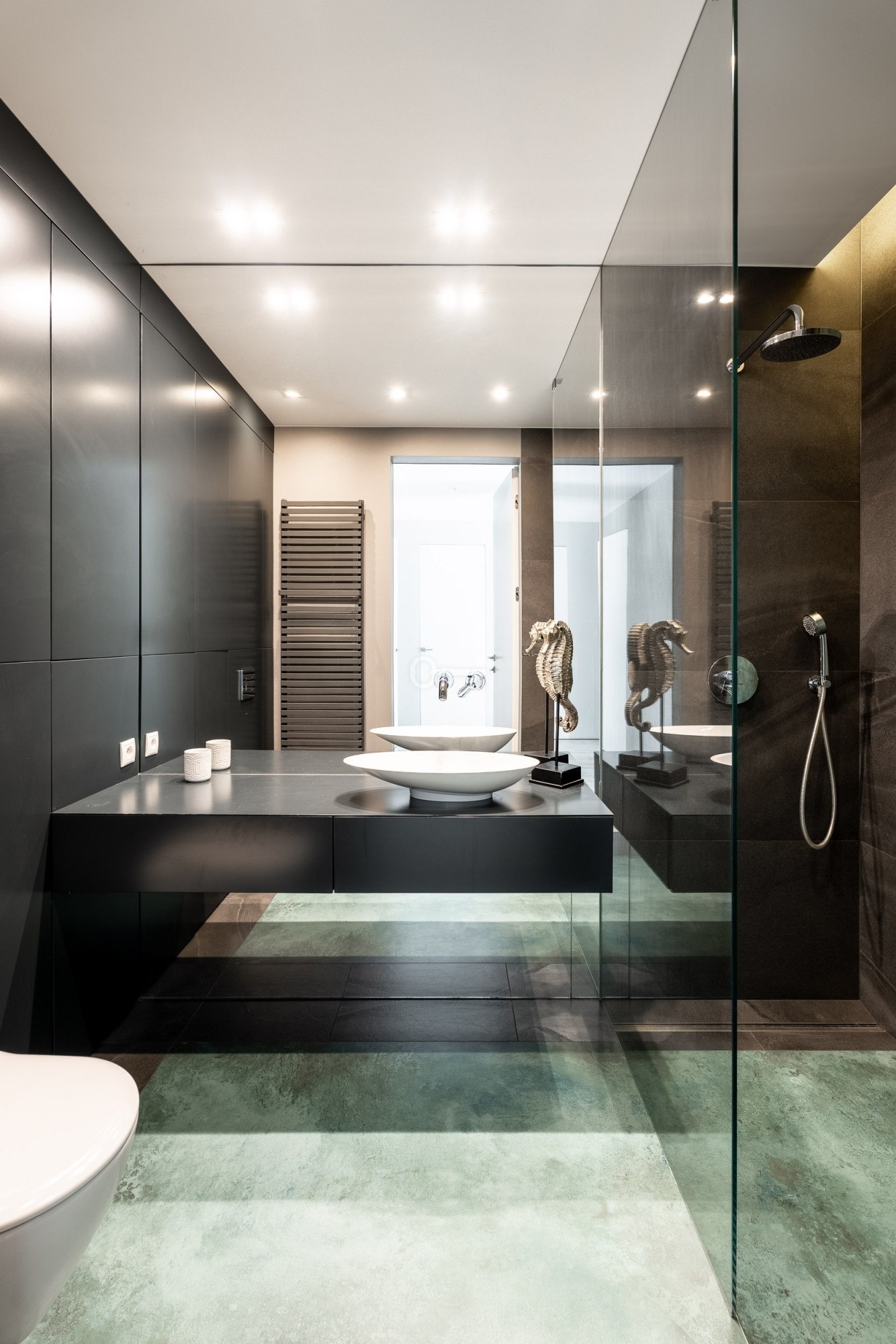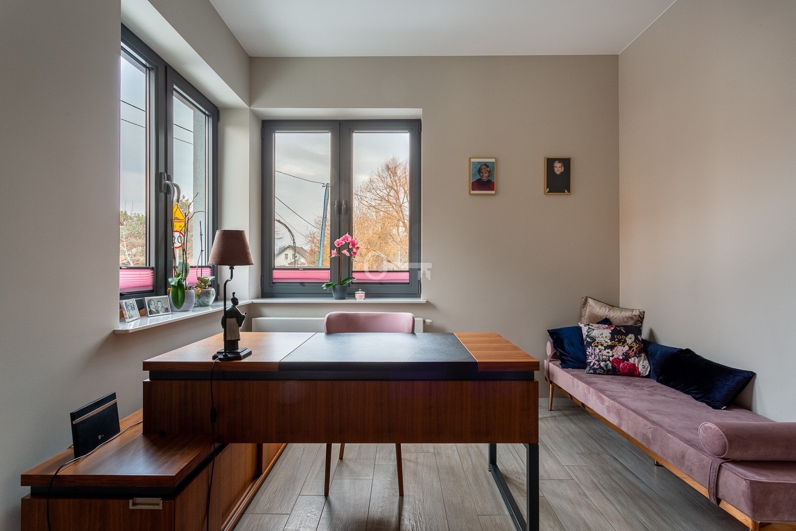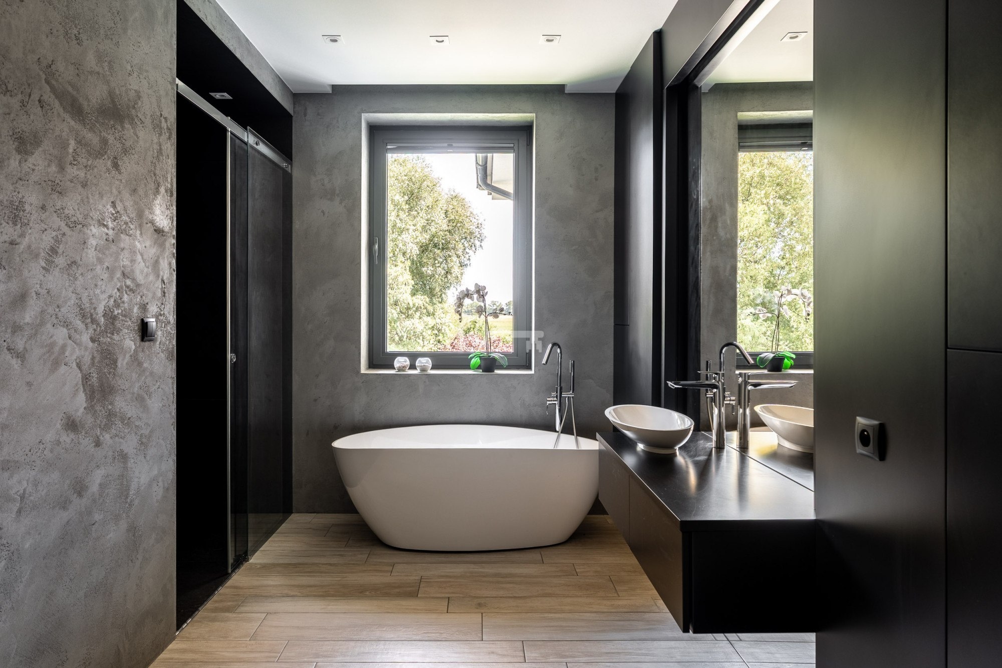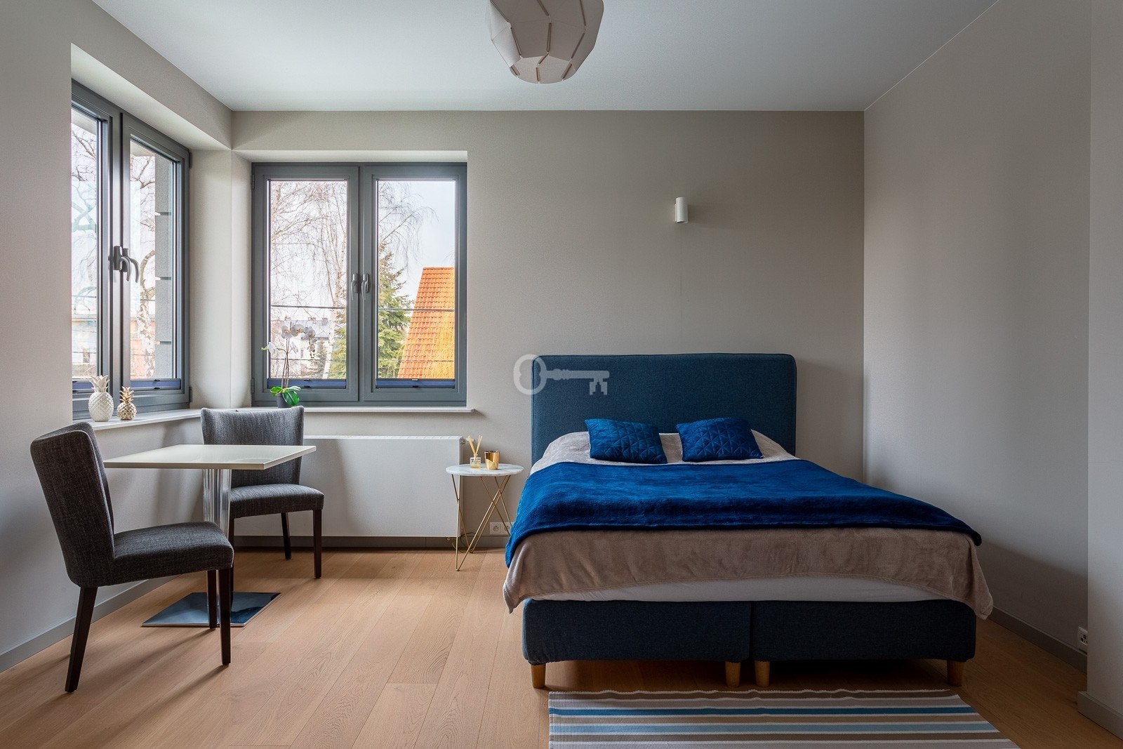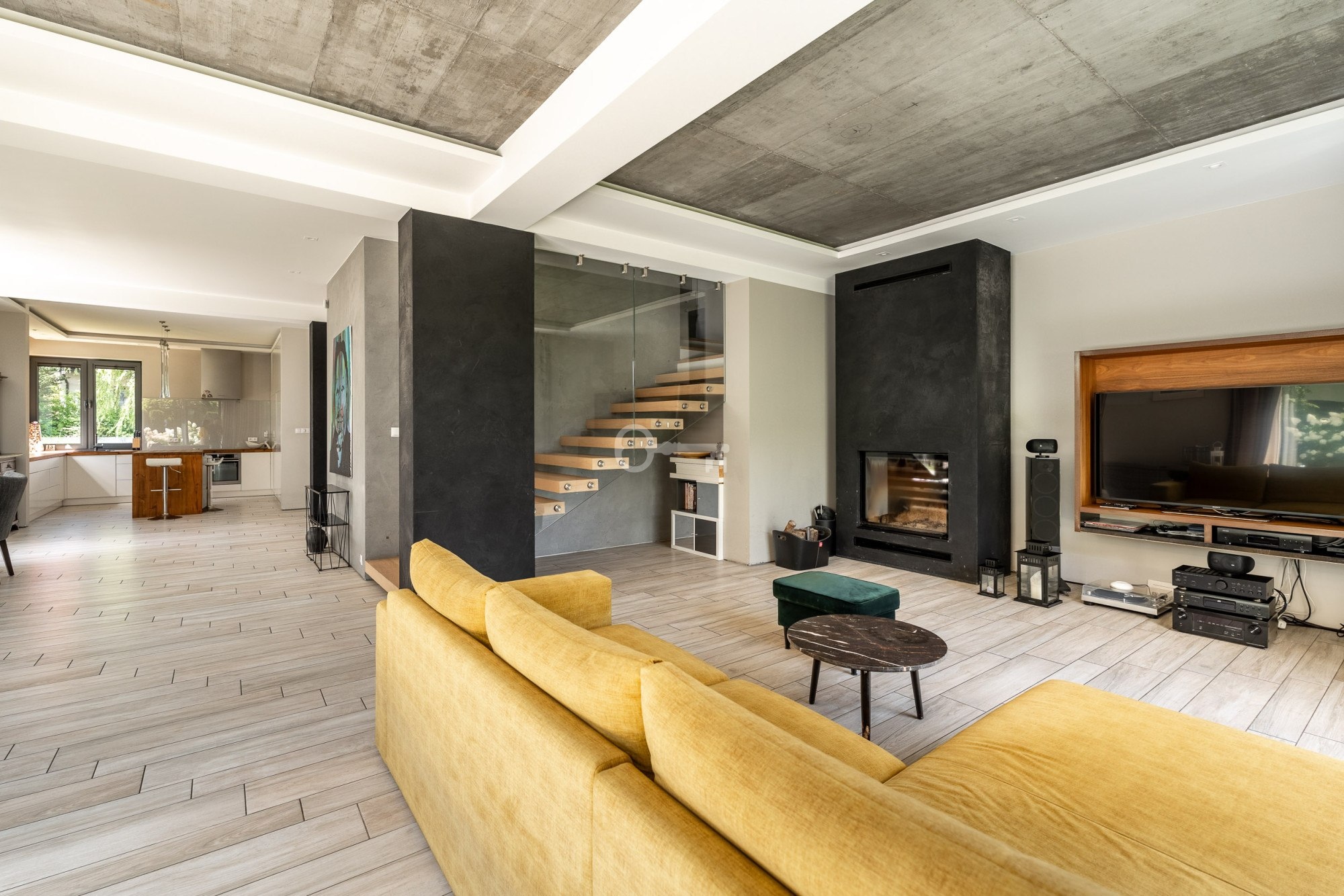 The floor is finished with tiles imitating wooden planks thanks to which there is underfloor heating in the living room, dining room and kitchen.