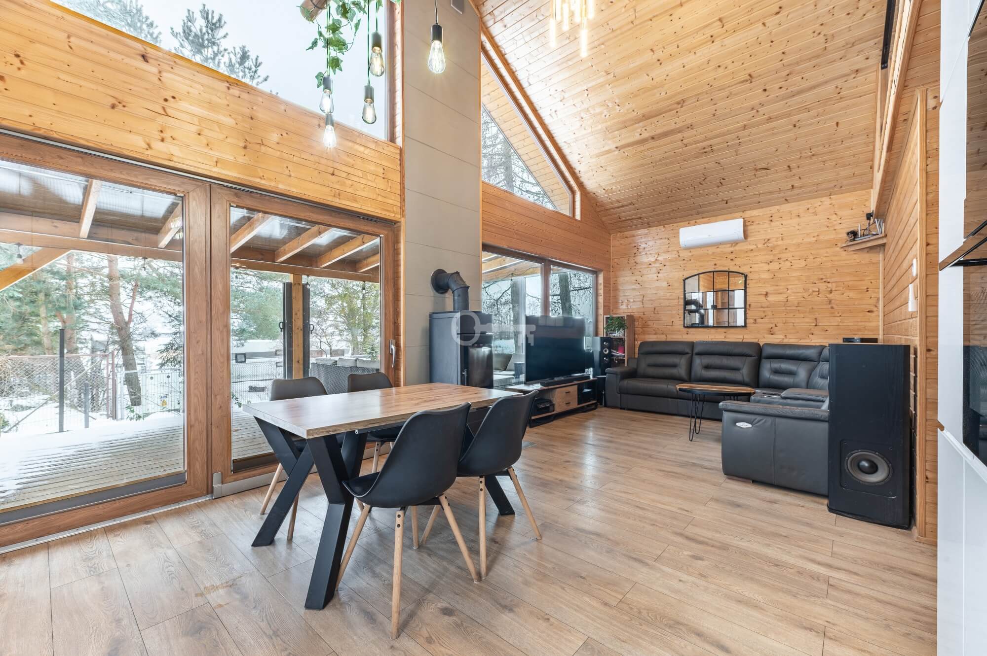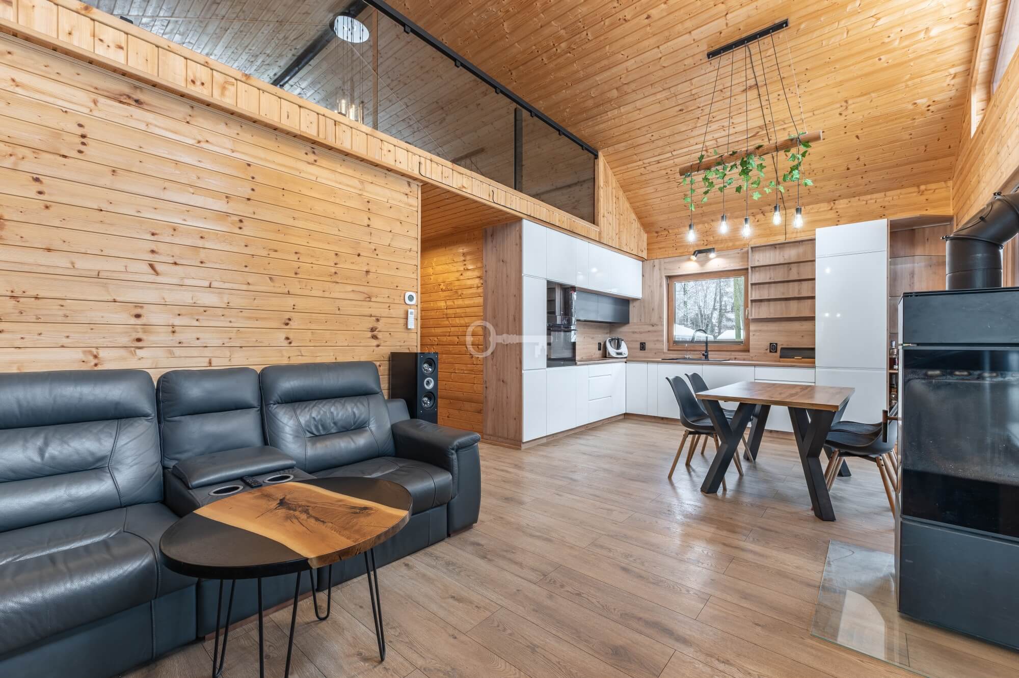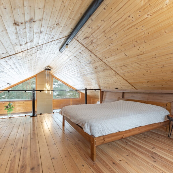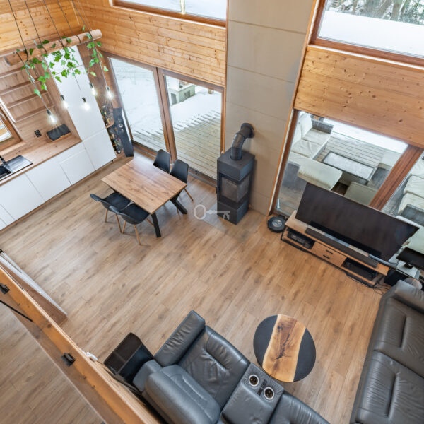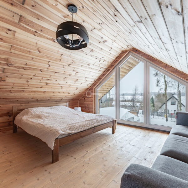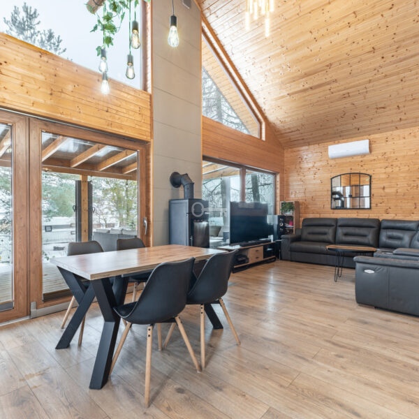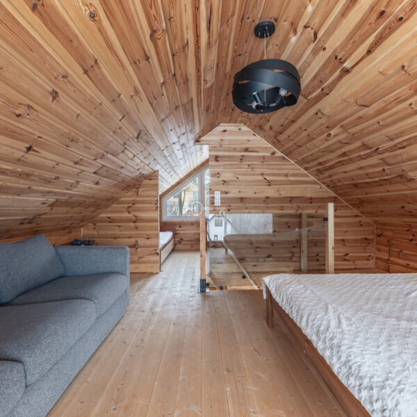 Year-round Main House: The heart of the home is an atmospheric living room with direct access to a sunny terrace. High ceilings and an open mezzanine, serving as the master bedroom, give the interior a remarkable sense of space. The natural wood finish creates a unique, soothing climate, while the wood-burning stove (“koza”) ensures a cozy atmosphere on cooler evenings.