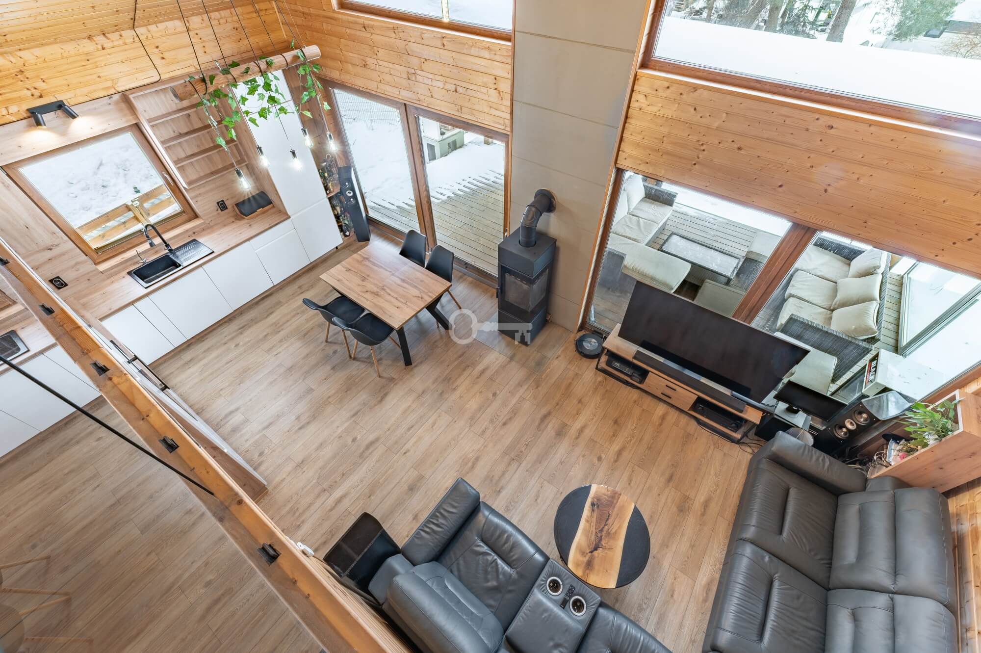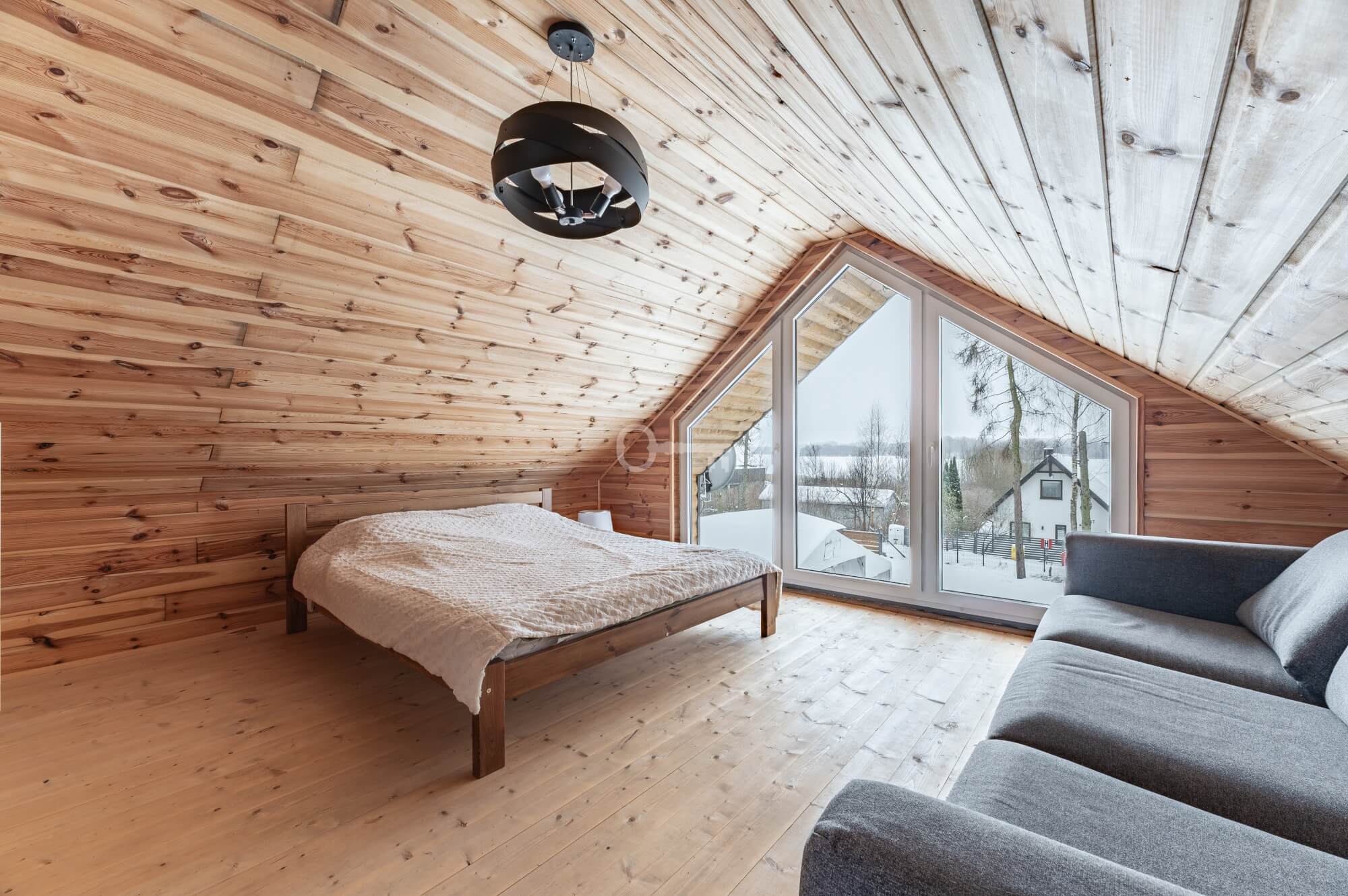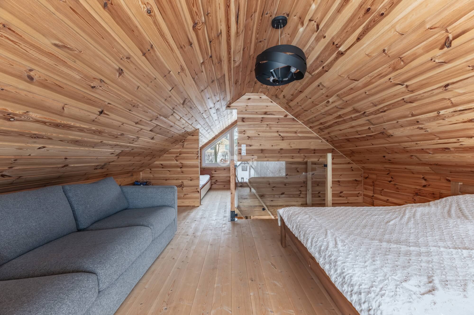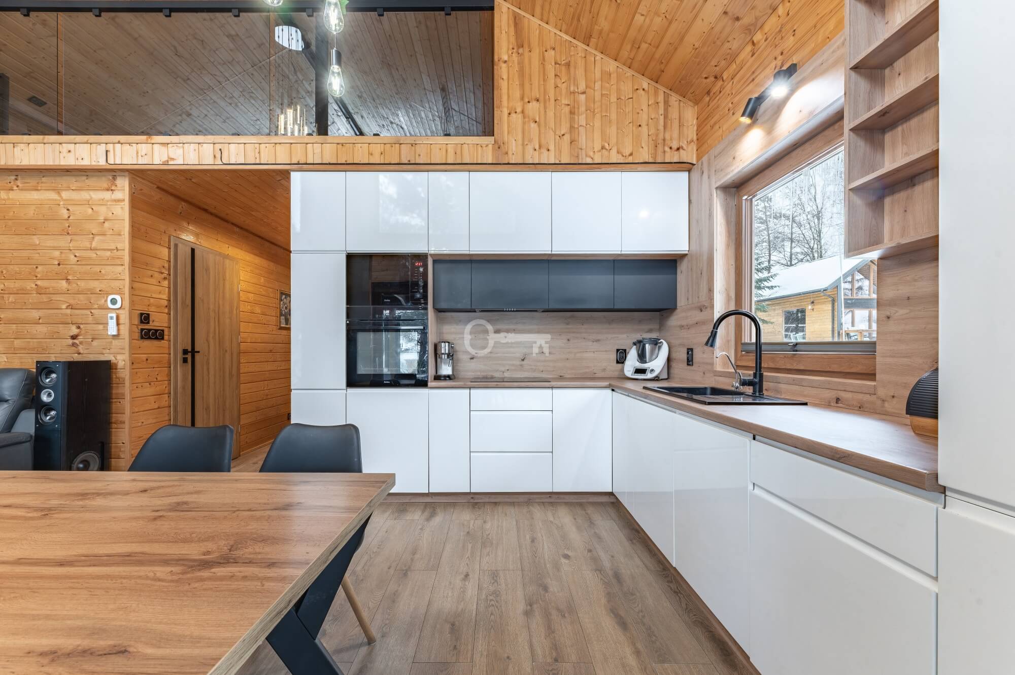 Year-round Main House: The heart of the home is an atmospheric living room with direct access to a sunny terrace. High ceilings and an open mezzanine, serving as the master bedroom, give the interior a remarkable sense of space. The natural wood finish creates a unique, soothing climate, while the wood-burning stove (“koza”) ensures a cozy atmosphere on cooler evenings.