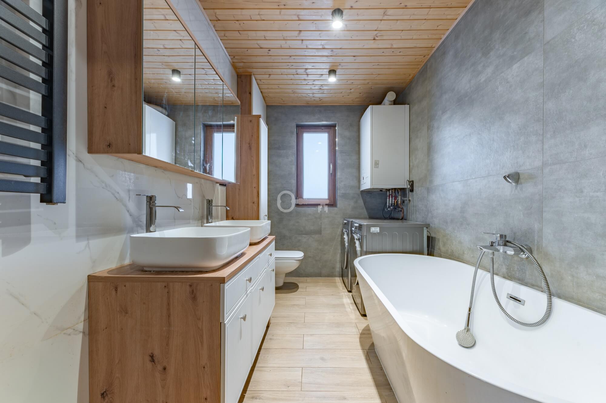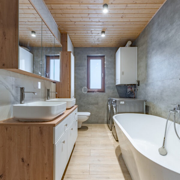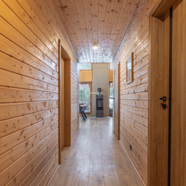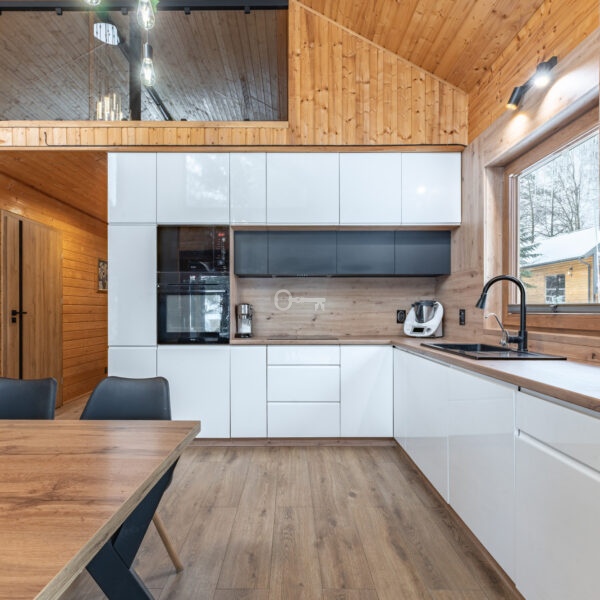 Both buildings are constructed using timber-frame technology on classic concrete foundations. They are insulated with eco-friendly wood wool (15 cm), ensuring excellent thermal performance. The roof is covered with coated steel tiles, also carefully insulated with 15 cm of wool. Heating is provided by modern, dual-function De Dietrich gas boilers.