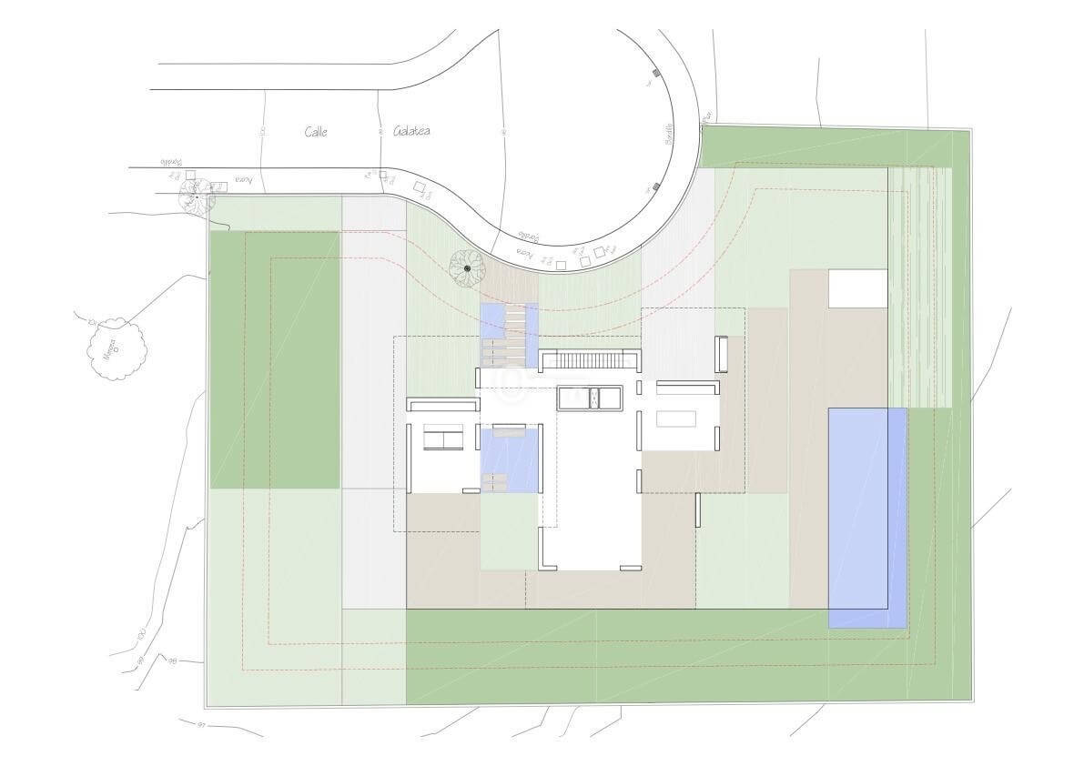 With UE-3 zoning regulations, the 800 m² plot allows for a 317 m² villa spread over two levels, including a rooftop terrace and basement, plus 100 m² of outdoor terraces for seamless indoor-outdoor living. A carport for two vehicles is also included in the plans.