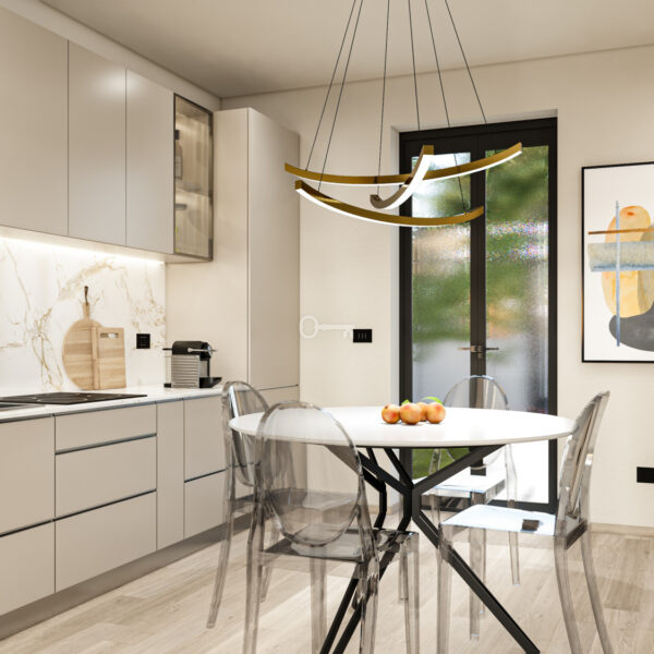 Na parterze znajduje się jasny salon z otwartą kuchnią i wygodną łazienką. Z parteru jest dostęp do prywatnego ogrodu, który stanowi zielony i relaksujący zakątek. Z parteru wchodzimy na drugie piętro, gdzie znajduje się część sypialna z dwoma wygodnymi sypialniami i dodatkową łazienką.