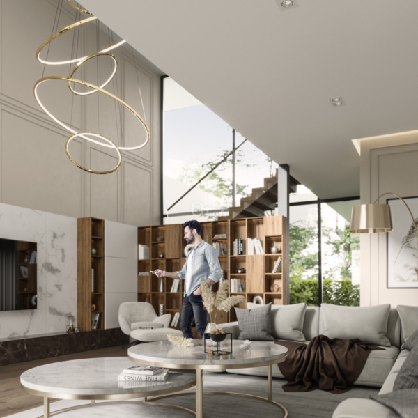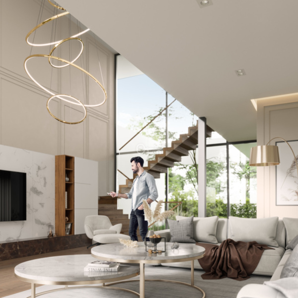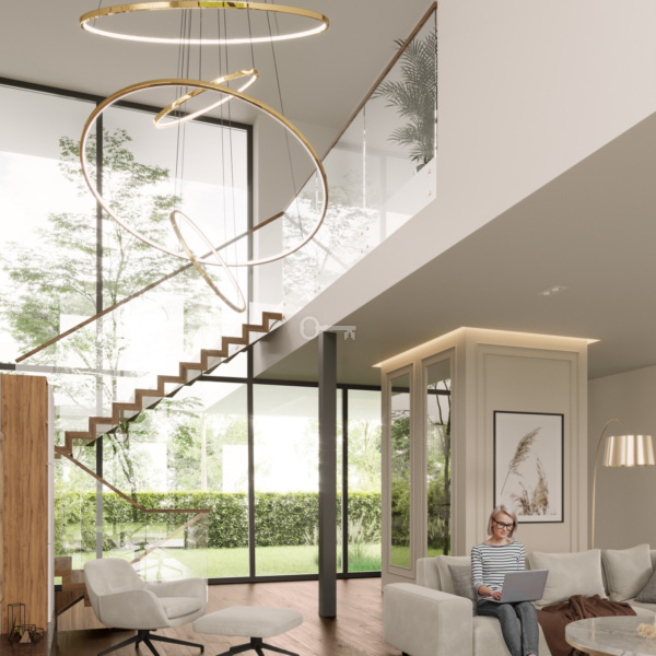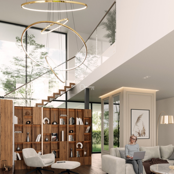 Wnętrza domów są wysokie i przestronne: kondygnacja parteru ma wysokość 3,05 m, półpiętro 3,17 m, a piętro 2,96 m. W miejscu, gdzie znajdują się schody, wysokość wyniesie około 6,5 metra, co spotęguje wrażenie przestrzeni i sprawi, że dom będzie prezentować się efektownie i stylowo.