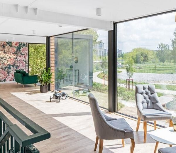 Projekt przewiduje dużą przestrzeń życiową, zapewniając mieszkańcom możliwość swobodnego korzystania z przestronnych ogrodów i tarasów. Dzięki temu każdy może cieszyć się własnym kawałkiem zieleni, nie opuszczając granic swojej nieruchomości. Duże, panoramiczne okna nie tylko zapewniają doskonałe doświetlenie wnętrz, ale także stwarzają wrażenie otwartości i bliskości z otaczającym krajobrazem.