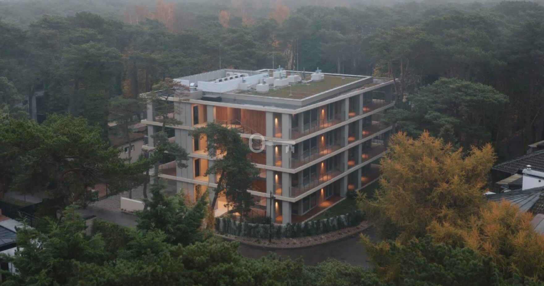 Architektura: Bryła budynku, zaprojektowana przez pracownię INTERURBAN architekci, opiera się na minimalistycznym dialogu drewna, stali i szkła. Panoramiczne przeszklenia na pełną wysokość pomieszczeń zapewniają doskonałe doświetlenie i łączność z naturą.