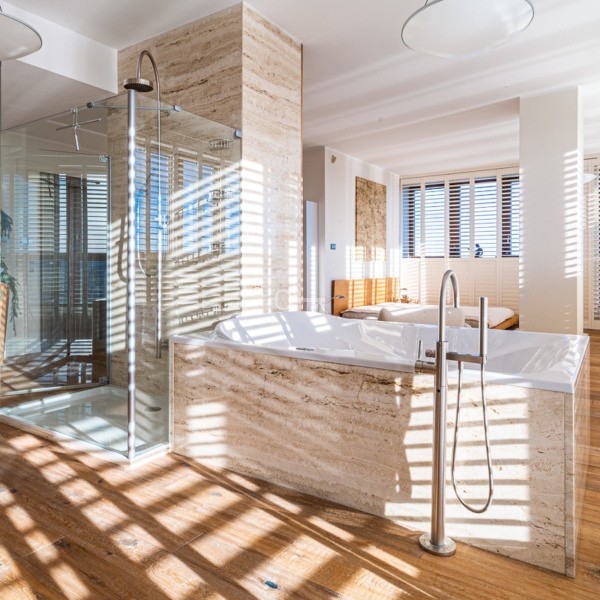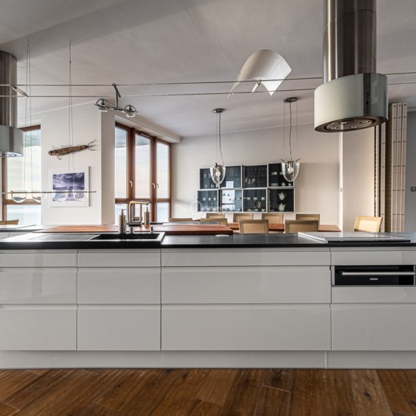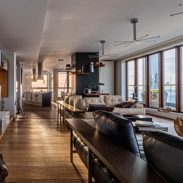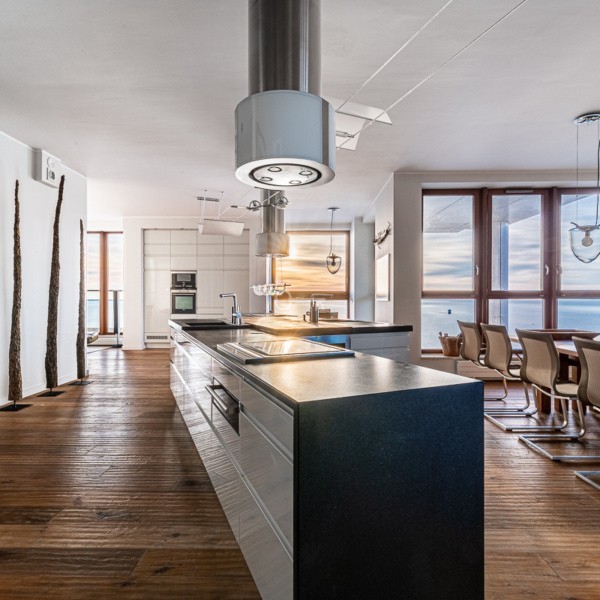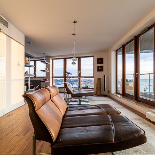 Zaledwie kilka metrów od linii brzegowej, a ponad sto nad jej powierzchnią, znajduje się „wisząca willa”, czyli niezwykła wizja znakomitego architekta Andrzeja Kapuścika. Zajmuje prawie 400 m2 otwartej przestrzeni, a rozpościera się z niej niepowtarzalny widoki na Zatokę Gdańską i Półwysep Helski. To właśnie widok jest motywem przewodnim, który towarzyszy nam w każdym pomieszczeniu od zmierzchu do świtu. Na całej długości penthouse’u znajdują się panoramiczne okna przez które możemy podziwiać wschody i zachody słońca, Plażę Miejską, port czy panoramę miasta. Wyjątkowość tej oferty może oddać fakt, że żaden inny apartament w Polsce nie posiada balkonu lub tarasu na tak wysokiej kondygnacji. Ten ma ich dwa z niezagrożonym widokiem na morze i plażę.