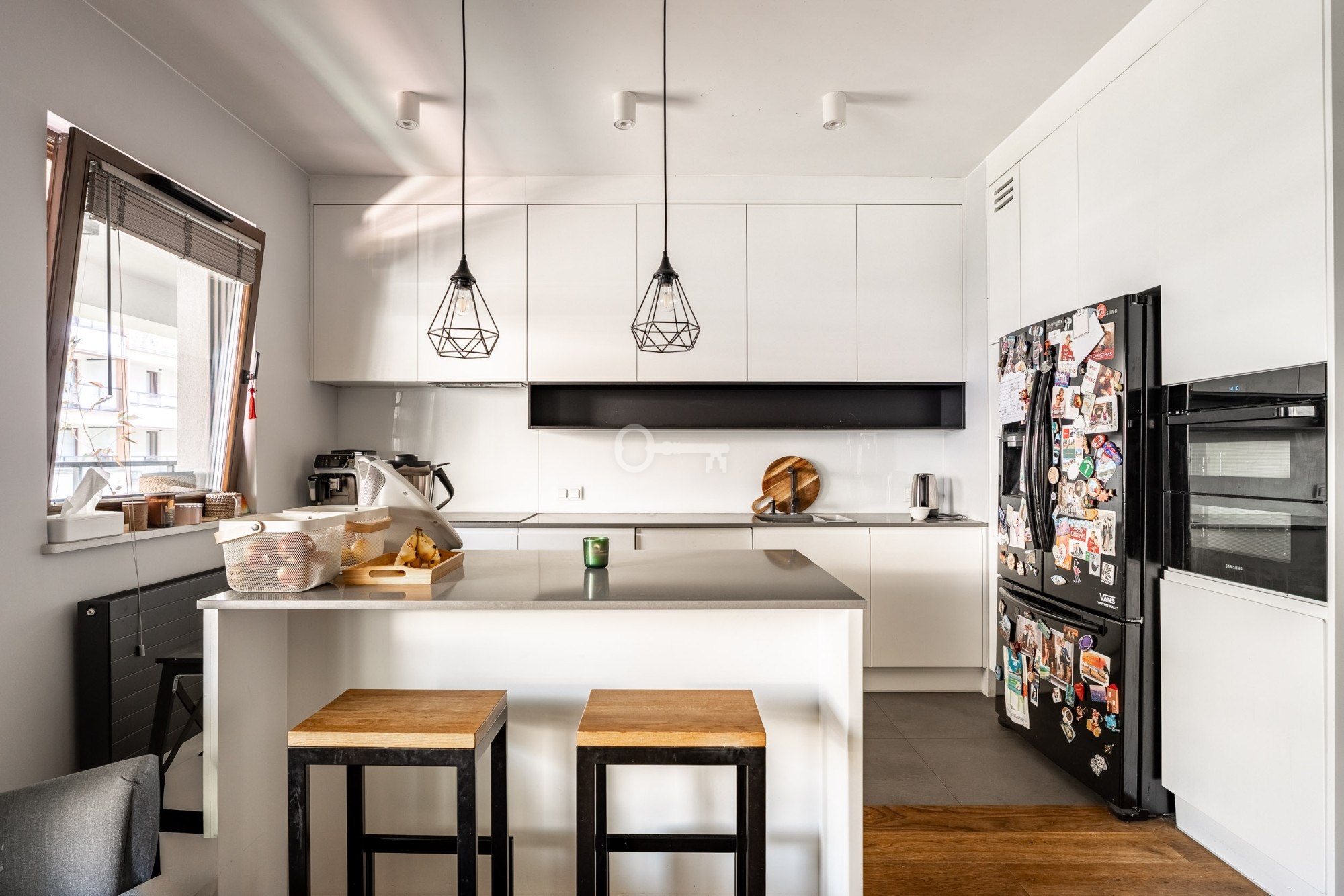 Kuchnia została wyposażona w sprzęt AGD renomowanych marek. Liczne pojemne szafki i funkcjonalne rozwiązania przechowywania łączą elegancję z praktycznością. Apartament położony jest w wyjątkowo spokojnej lokalizacji – okna wychodzą zarówno na zielone patio, jak i na drogę przeciwpożarową, po której nie poruszają się samochody, co zapewnia ciszę i komfort.